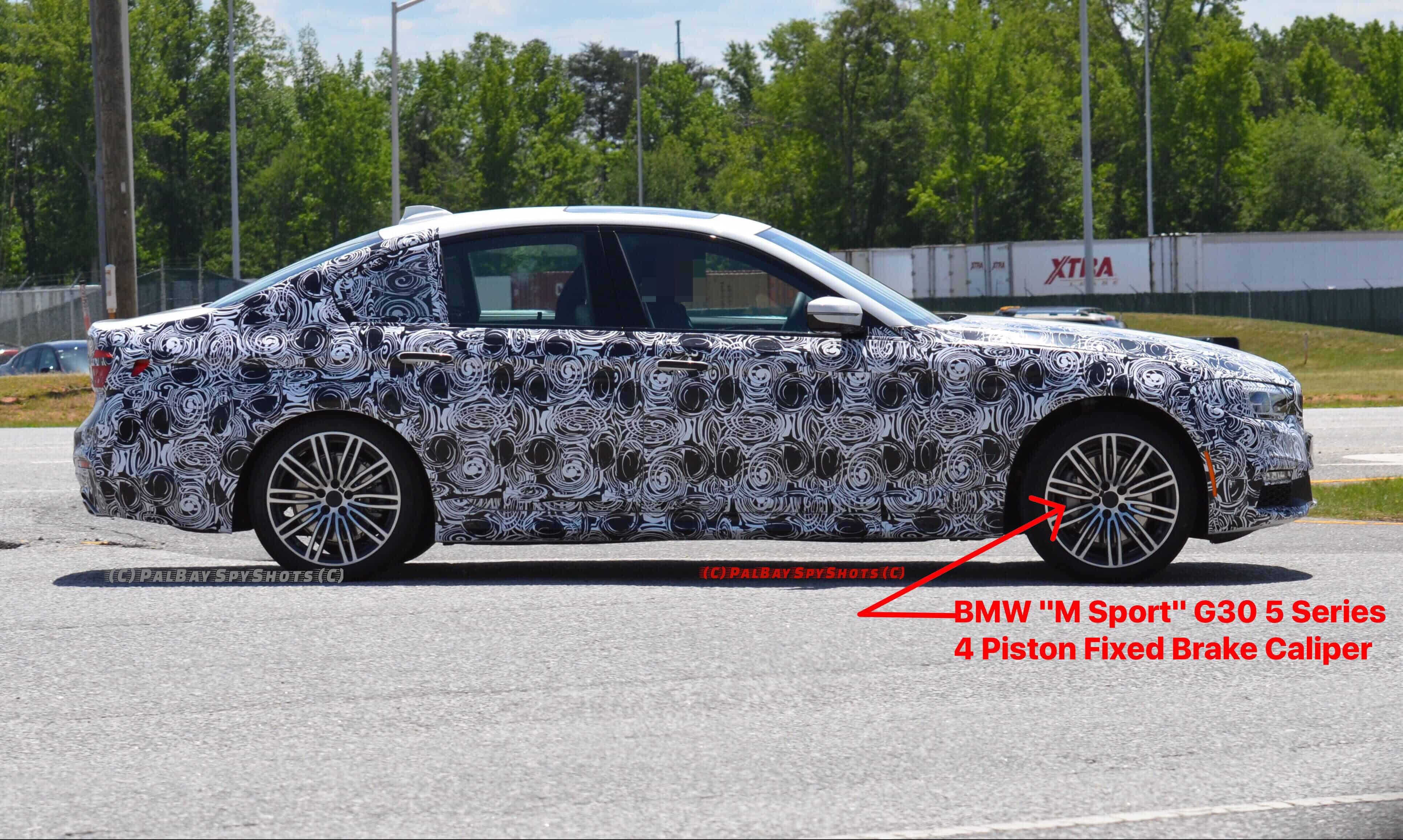 The first 2017 BMW G30 5 Series with an M Sport Package was spotted in South Carolina by the usual spy photographer Palbay. The images reveal the typical M Sport wheels with the four-piston brake calipers and a black tape covering the small “M” logos found on all the BMW M Sport models.