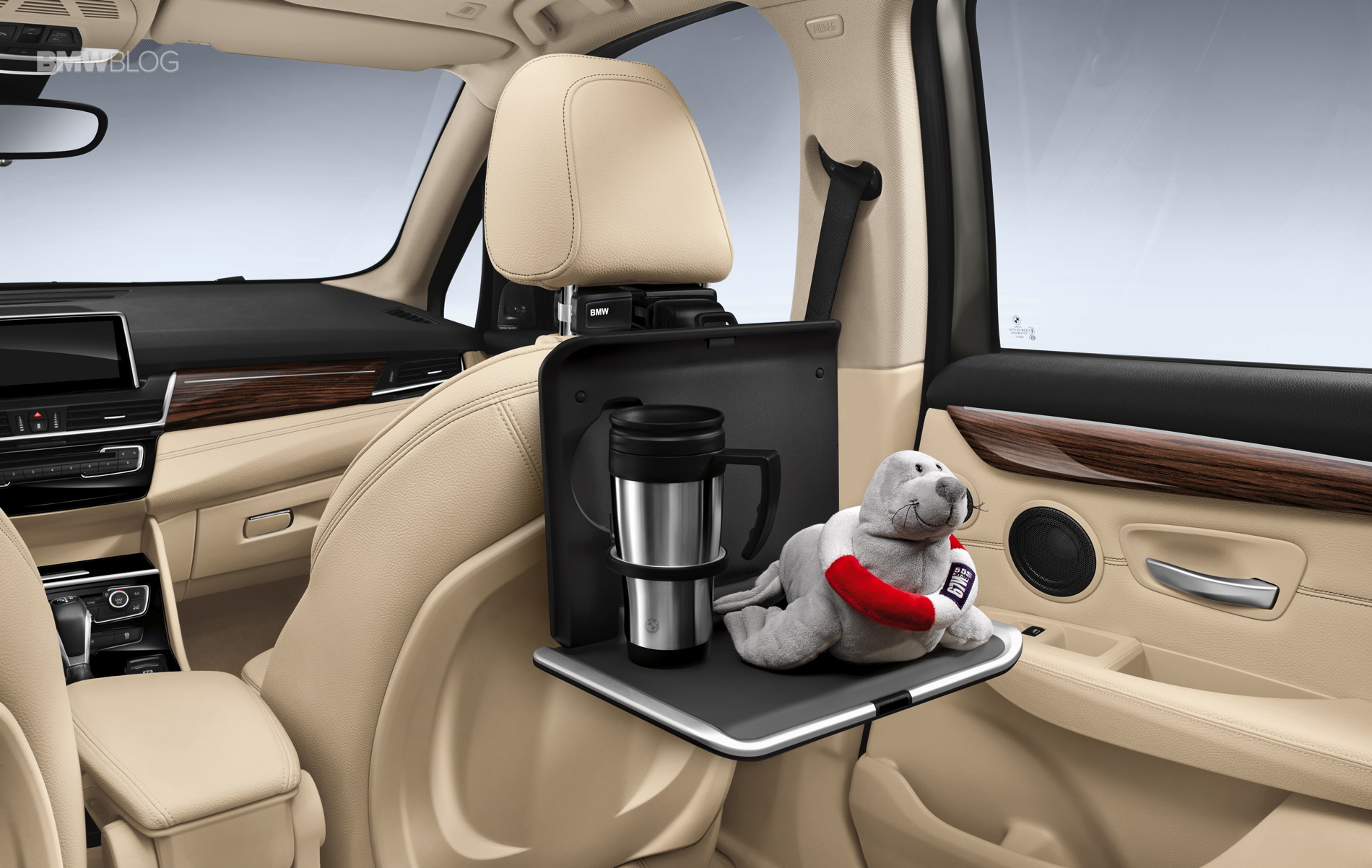 The modular BMW Travel & Comfort System enhances the pleasure of travelling and comfort inside the car. By means of a slip-in connector, this system permits simple and secure attachment of various different system components to a base carrier, which is mounted on the headrest bars of the front seats. There is, for example, a holder for various Apple iPads and Samsung Galaxy tablets. The holder can be pivoted, angularly adjusted and rotated by 360 degrees – convenient for watching films in landscape format and, in portrait format, ideal for office activities. If desired, a folding table, which is adjustable in height and inclination and features an integrated cup holder, can also be attached to the base carrier, as can a coat hanger or a universal hook.