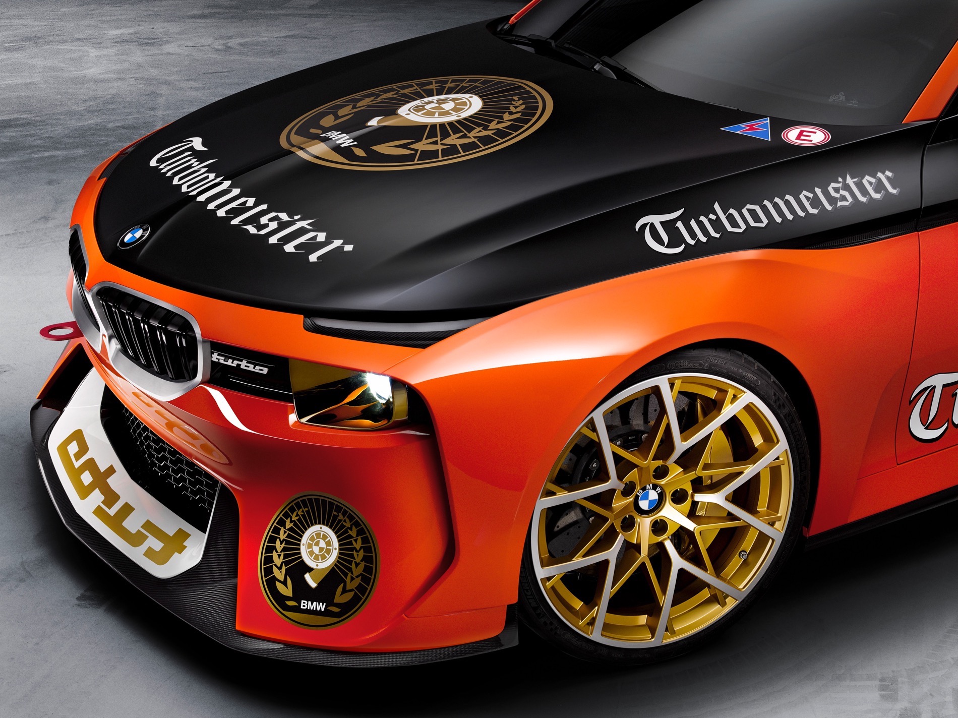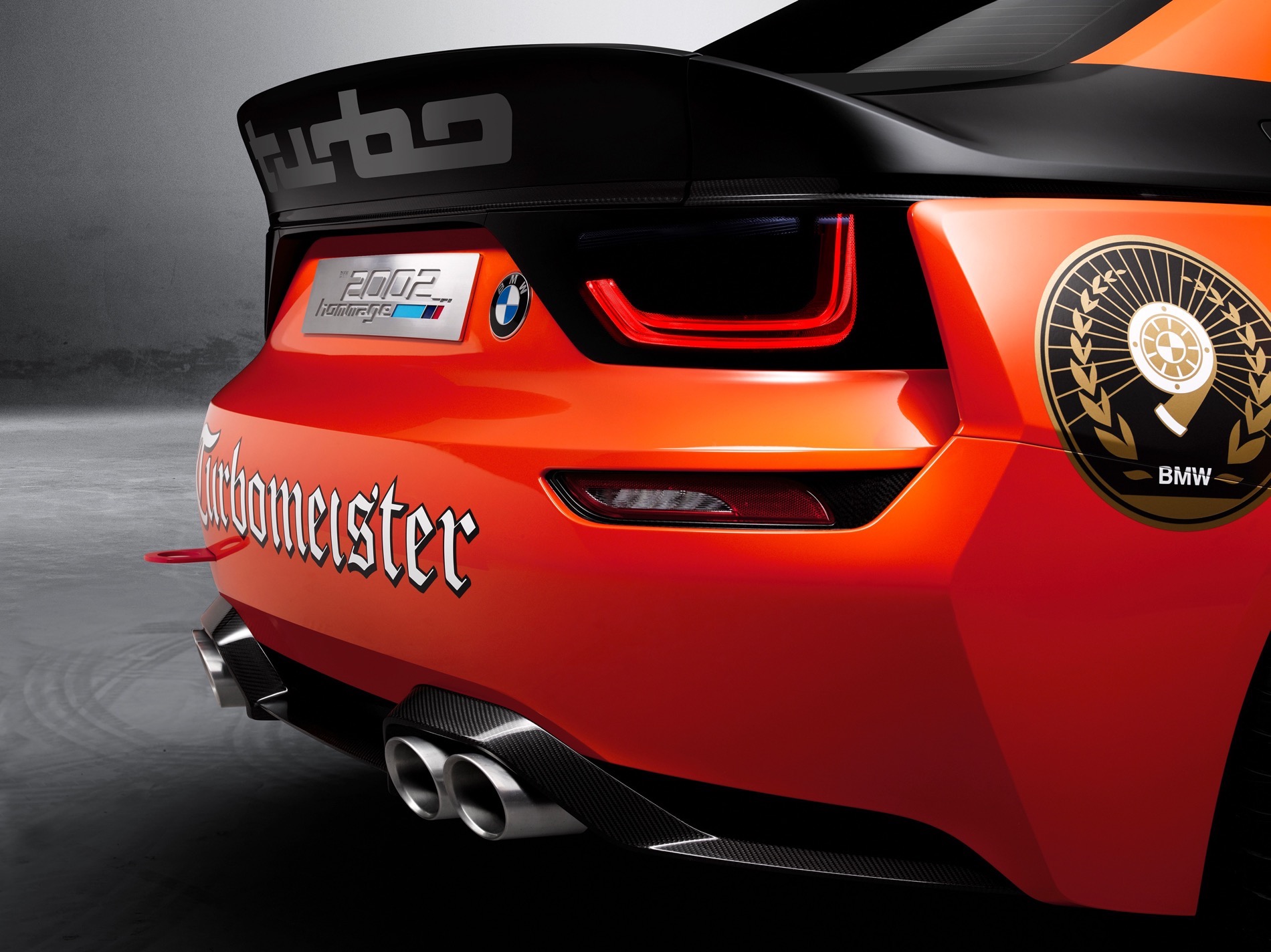 The gold in the headlights is to both honor the “Golden” 50th anniversary of the BMW 2002 and to be vaguely reminiscent of the sort of gold-inited headlights of racing cars back in the day. It’s also wears ‘Turbo’ badges on both the front splitter (backwards, just like the original BMW 2002 Turbo) and on the massive rear wing. ‘Turbomeister’ badges also adorn the car’s hood, fenders and rear bumper.