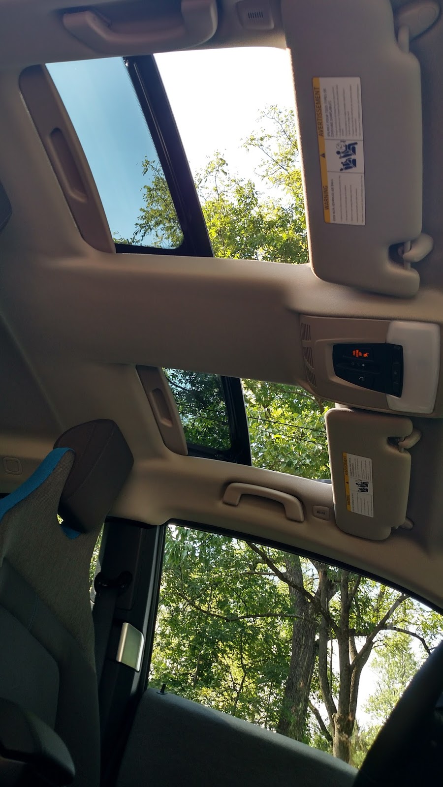 The moonroof is a new option for the US. It’s been available all along for i3s outside of North America, and now it’s available here also. The moonroof is a $1,000 option and is a split version, having two openings separated by a solid center section. Each opening has its own manually-operated sunscreen, but the moonroof itself is one piece, and slides back with a push of a button. However it only opens about eight inches, slightly more than half of the actual opening in the roof. It’s not even large enough to stick your head out of it – not that you would want to do that; but the point is, it’s a small opening. The moonroof does accomplish two things, though. It allows more light in the cabin, giving the feeling of it being more open. It also allows you to eliminate side window buffeting by simply tilting the moonroof open.