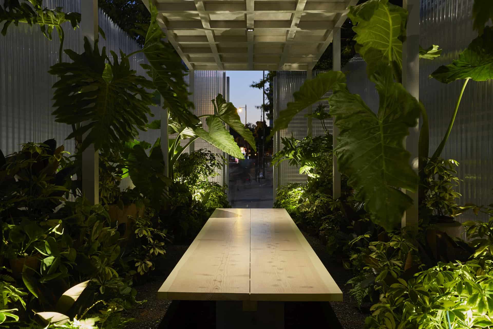 The installation is made up of three rooms, the Connect Space, Create Space and Relax Space. The Connect Space is a place for meeting up and catching up – spontaneously or pre-planned. A large table forms the centerpiece of the room, which can be used as an evening dining area, for example. The plants both allow visitors to immerse themselves deeply in the forest ambience and play their part in an extremely intense communication experience.