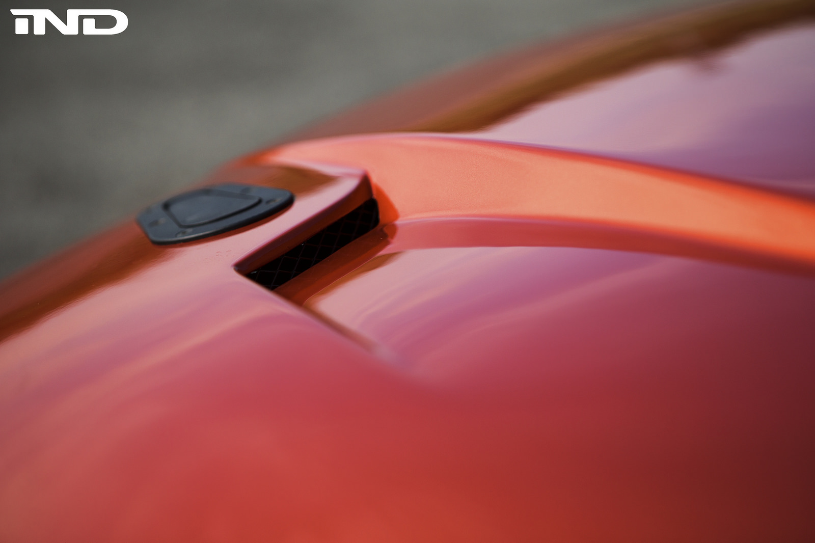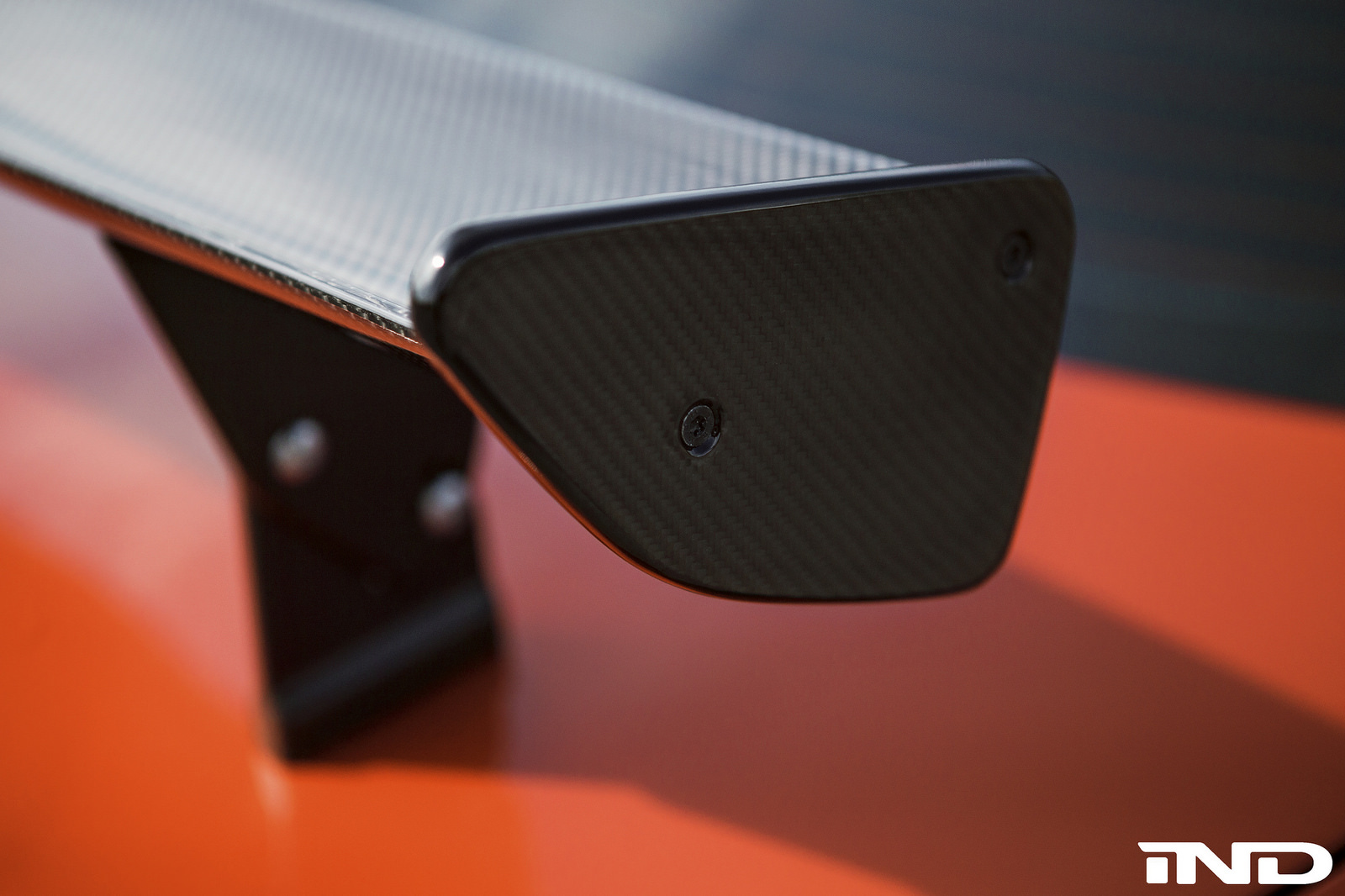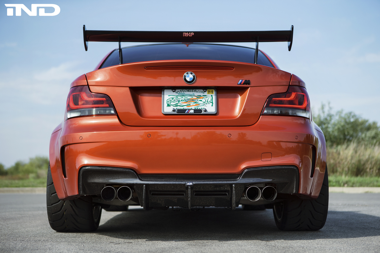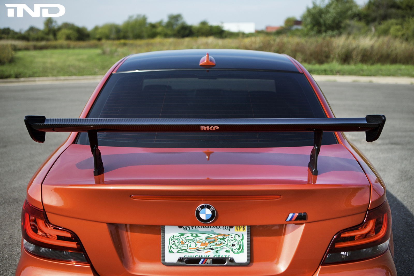 For this BMW 1M project, IND Distribution aded a RevoZport carbon fiber hood, aerocatch hood pins, a RevoZport carbon fiber trunk, all complemented by a RevoZport carbon fiber diffuser and a somewhat ricey but cool, RKP ClubSport wing. The lightweight carbon fiber front lip ensures added downforce, giving the vehicle and driver, improved handling, better cornering performance and improved driving dynamics.
