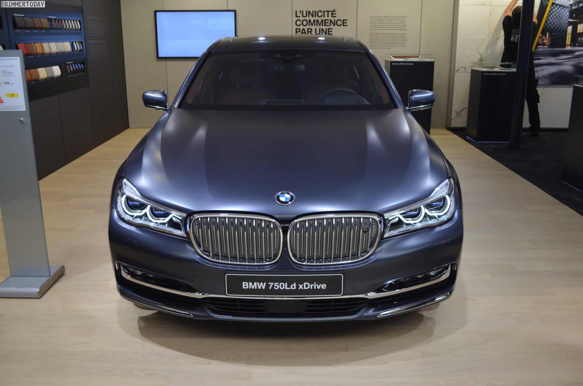 The second world premiere at the BMW stand at the 2016 Paris Motor Show was the new BMW 750d xDrive with a quad turbo diesel engine. Maybe not as flashy as the X2 Concept premiere, the powerful and economical 7 Series is just as impressive at a first glance. The car presented in Paris is the BMW xDrive 750Ld wearing a matte finish in the Individual Frozen Artic Grey color with some metallic flakes at closer inspection. The chrome-plated elements of the Design Pure Excellence package also provide some shiny accents for the matte paintwork.