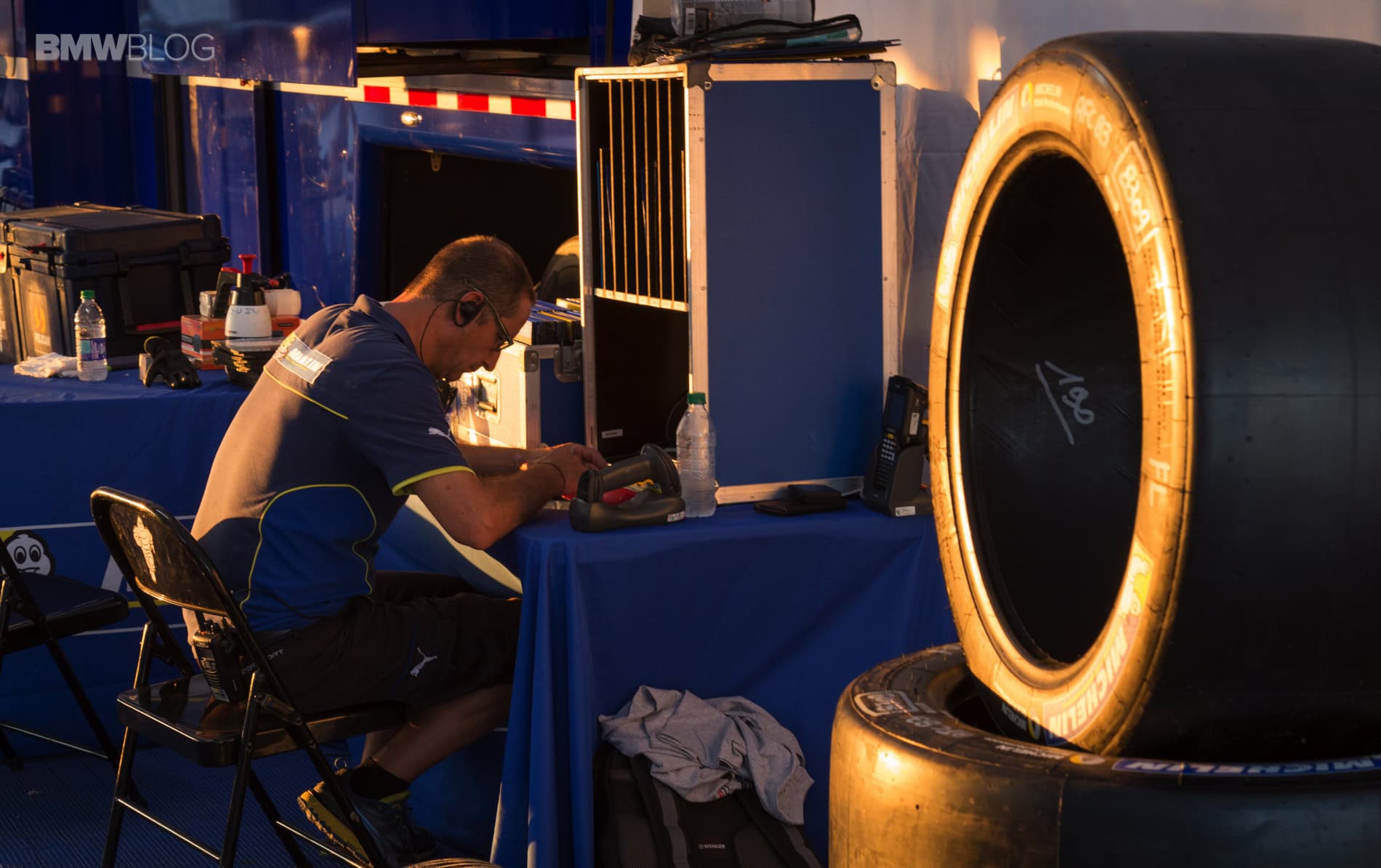 Before we knew it, they were waving the green flag and the race was off and running. Once they had settled in, we made our way over to the Michelin tire compound where they were just starting to dismount the first sets of tires. After our tour, one of the Michelin technicians gave us a quick demo and then we actually got to jump in and pop the beads on some of the race tires. For all we know, one of the teams could have raced to victory on a tire that we helped mount!