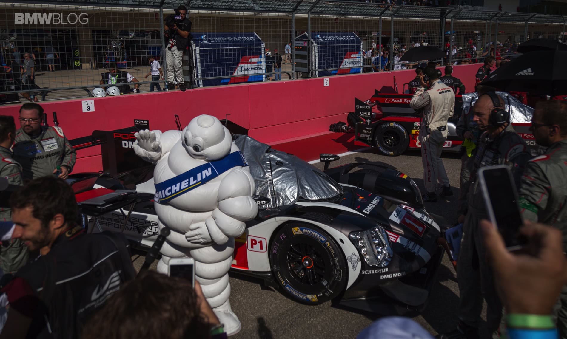When we arrived at COTA, there were golf carts waiting to transport us to the suites overlooking the main straight. Michelin had reserved a large VIP suite right above pit lane with every amenity that you could wish for, including a masseuse! First on the schedule was private meet-&-greets with BMW Motorsport veteran Bill Auberlen in the BMW Team RLL paddock and Porsche Motorsport in their LMP1 garage.