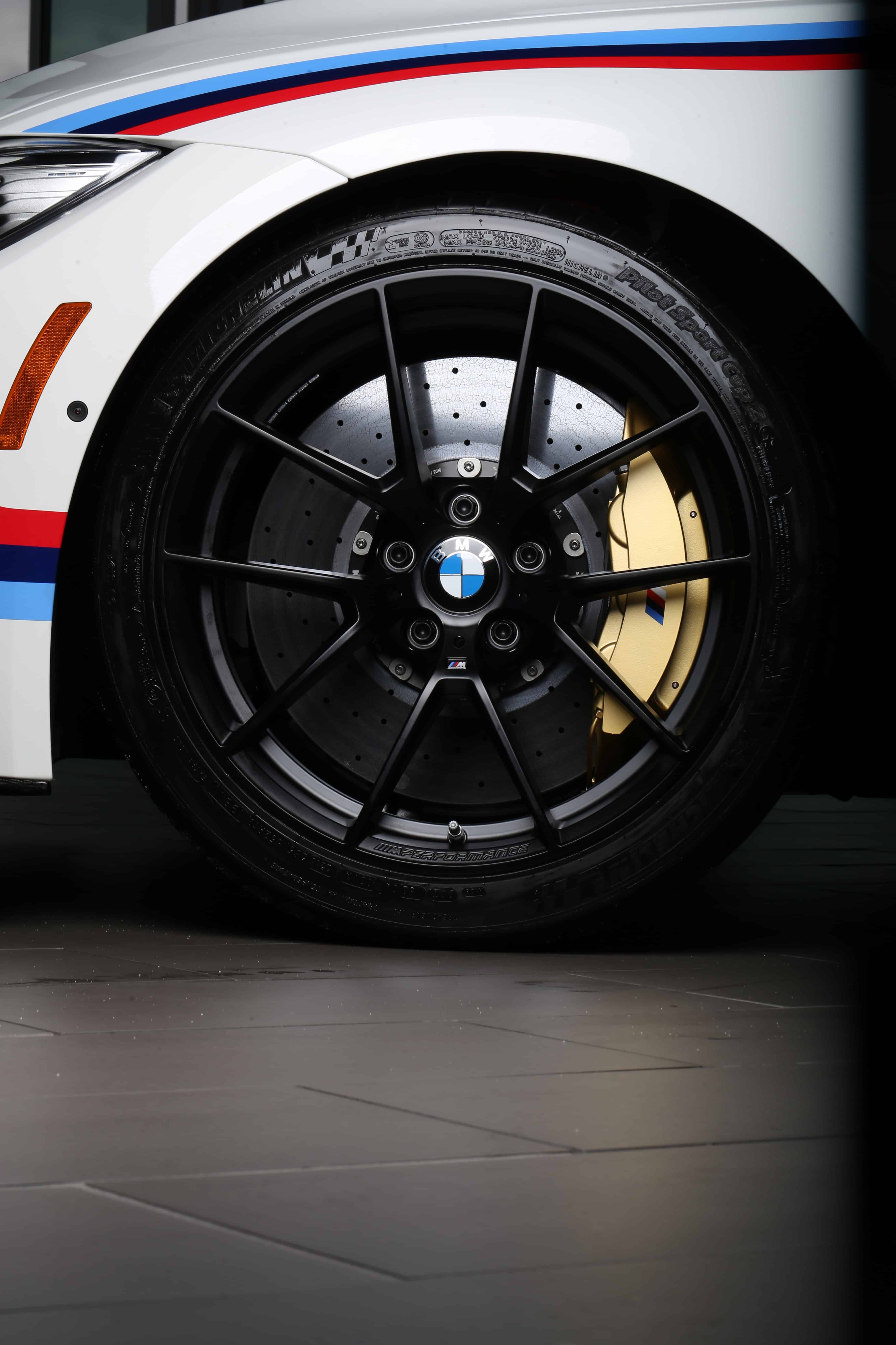 One of the most significant innovations being presented by BMW at the 2016 SEMA Show is the new light alloy wheel displayed as a concept wheel on the BMW M3 (19-inch at the front, 20-inch at the rear). Derived directly from motor racing, the M Performance wheel, which is milled and weight-optimized entirely from a forged blank, contributes – compared with wheels fitted with standard tires – towards even better steering behavior, resulting in a further increase in driving dynamics. This is complemented by the exclusive styling of the wheel set, which is shown in Black matte and with “M Performance” lettering on the rim flange and matched with Michelin Pilot Sport Cup 2 tires for maximum grip and performance.