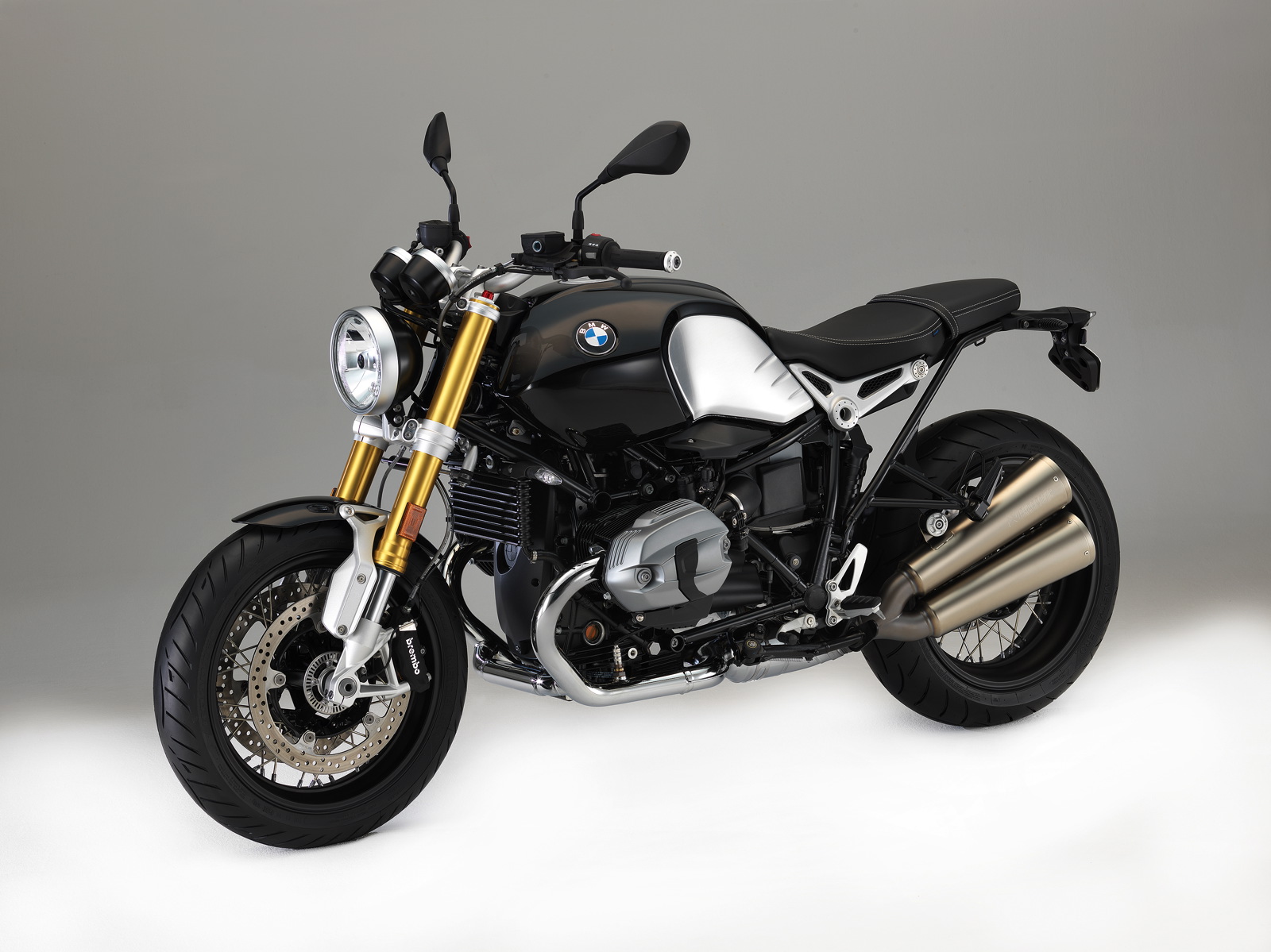 - R nineT in classic roadster design in Blackstorm metallic in conjunction with a black frame and drivetrain.