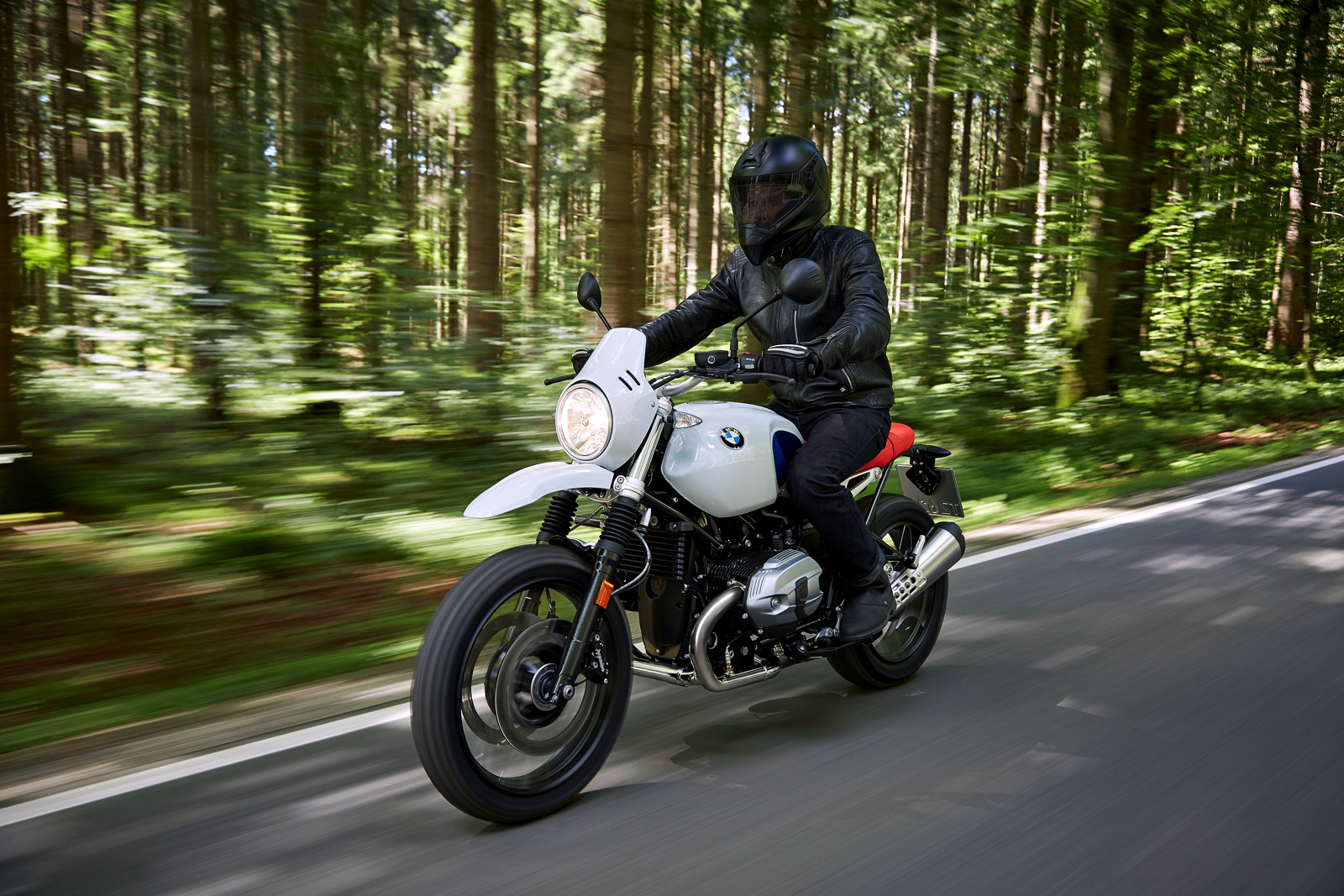 - R nineT Urban G/S in Lightwhite non-metallic combined with fuel tank decor in two blue tones with a bright red seat – echoing BMW Motorsport colours of past years.