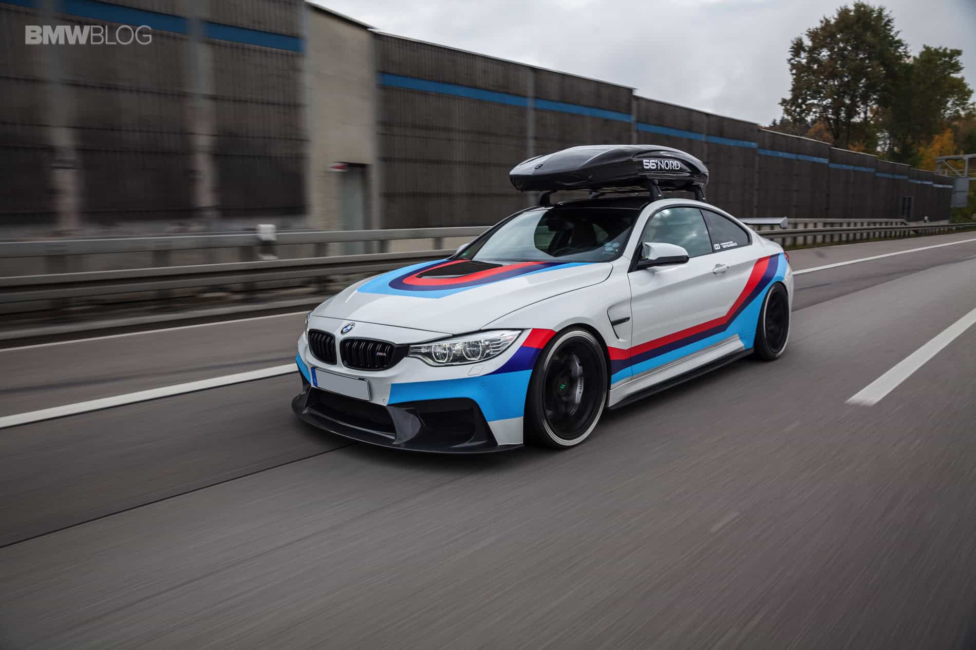 The 56°NORD carbon roof box has been tested at speeds of up to 300 km/h, and has a capacity of 405 liters and a unique 300-degree unobstructed access. The whole optics are rounded off by a GT4-style wrapping from Revowrap, which illustrates the racing ambitions.