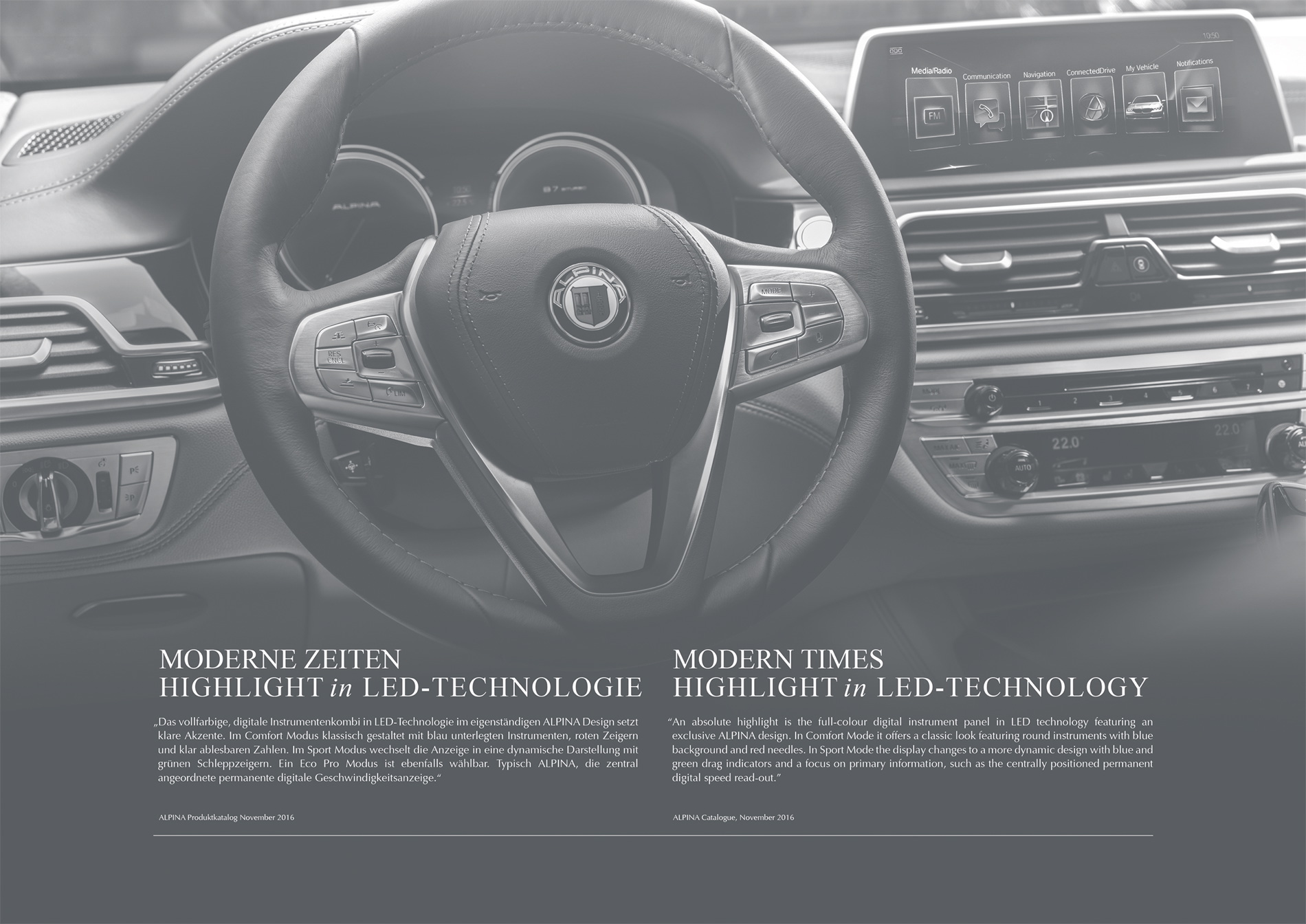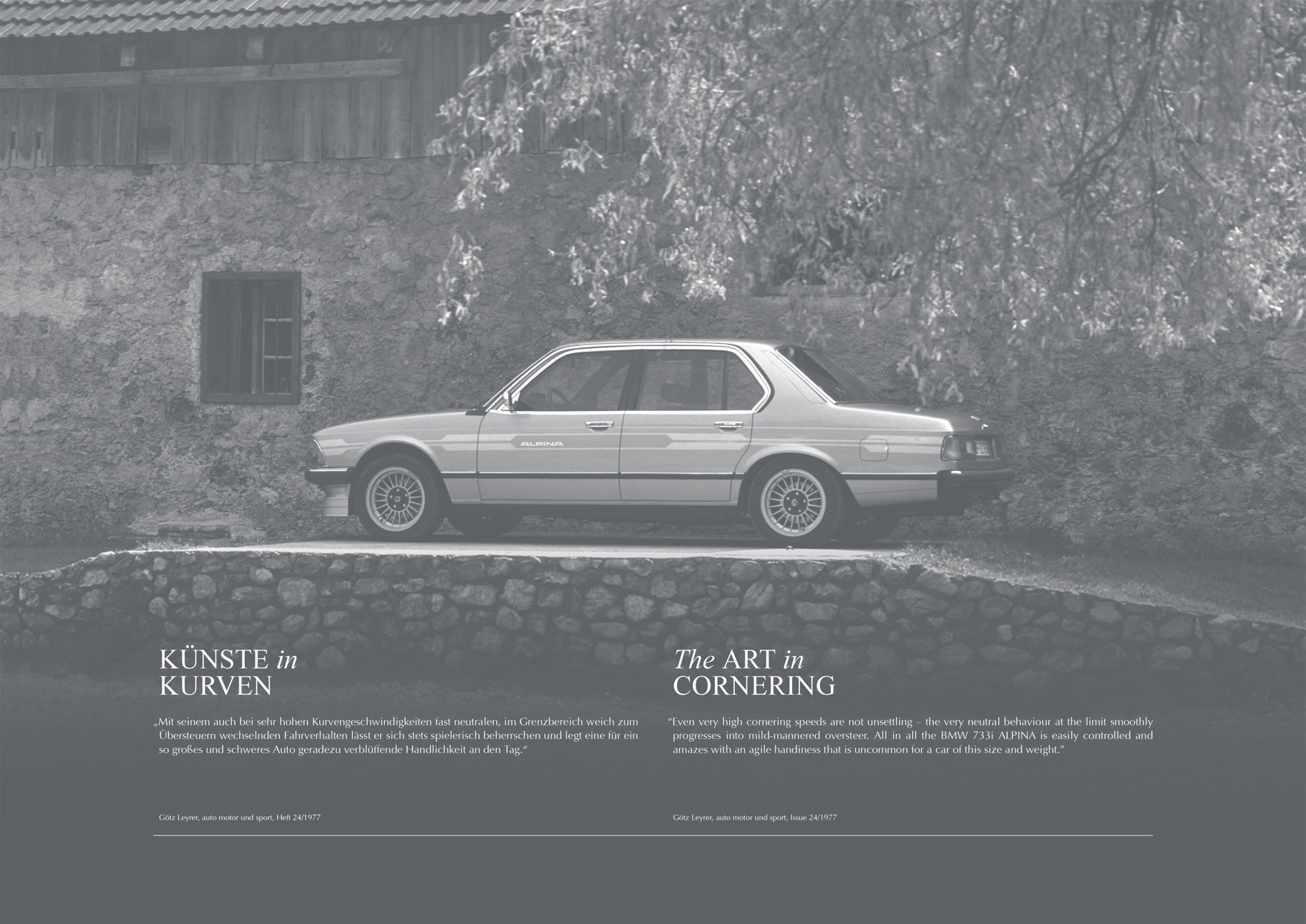 Each month shows an artfully arranged, perspective photography of the six selected luxury saloons, each of which held a unique position within its class at the time. Along with historic photographic material, each back page – printed in monochromatic sophisticated silverfeatures remarkable quotes from press reports of that era or excerpts from product catalogues in German and in English.