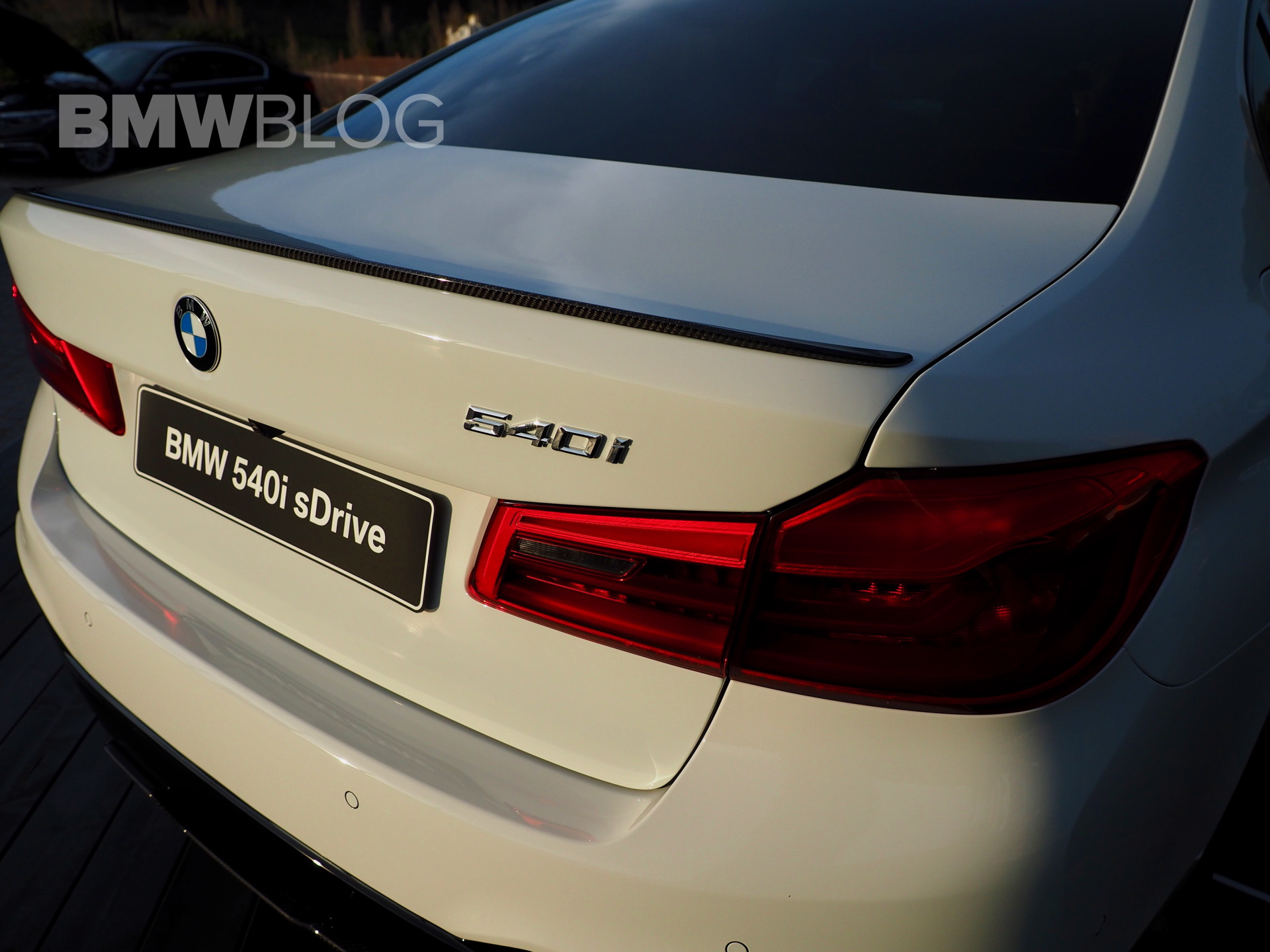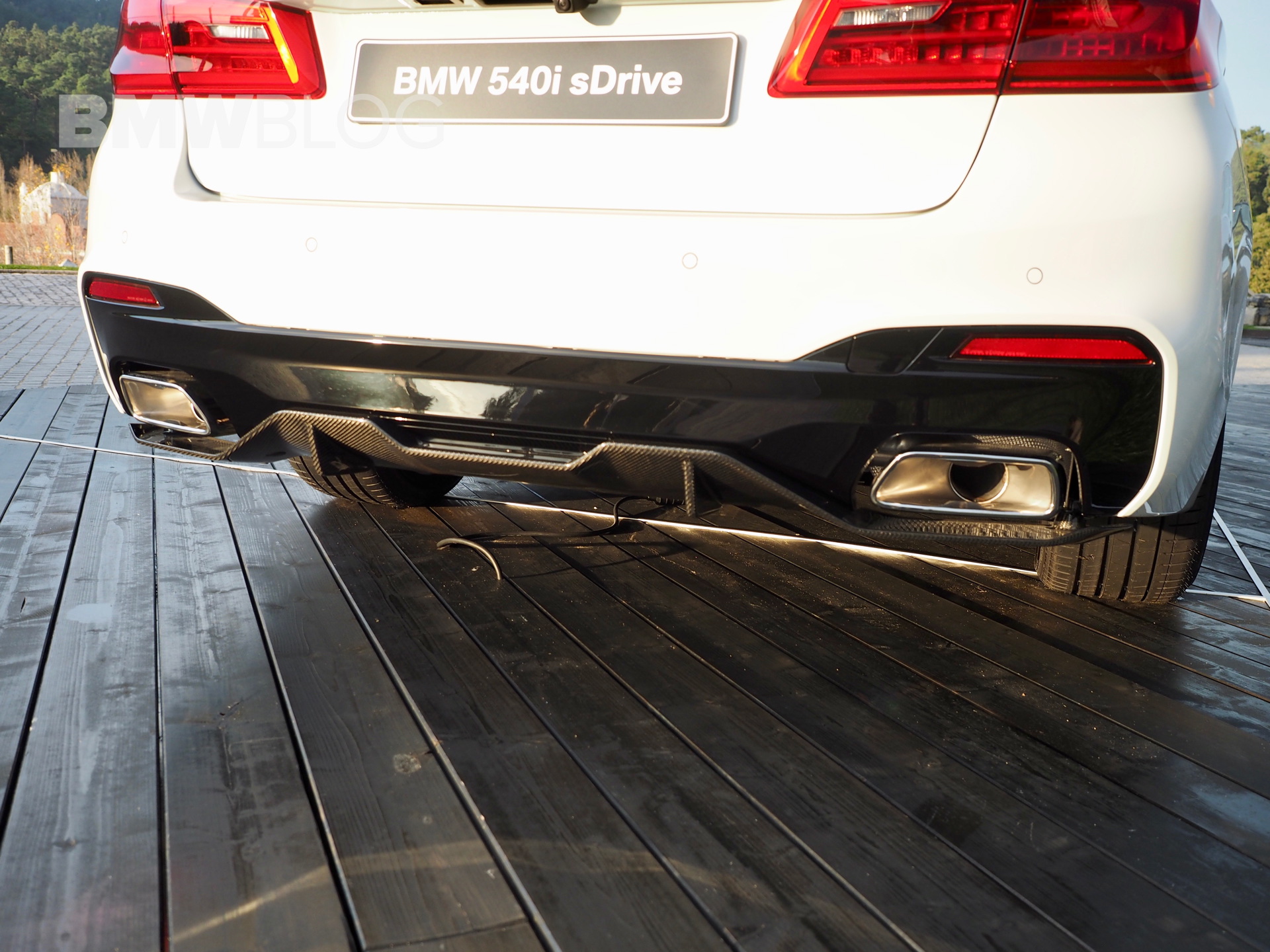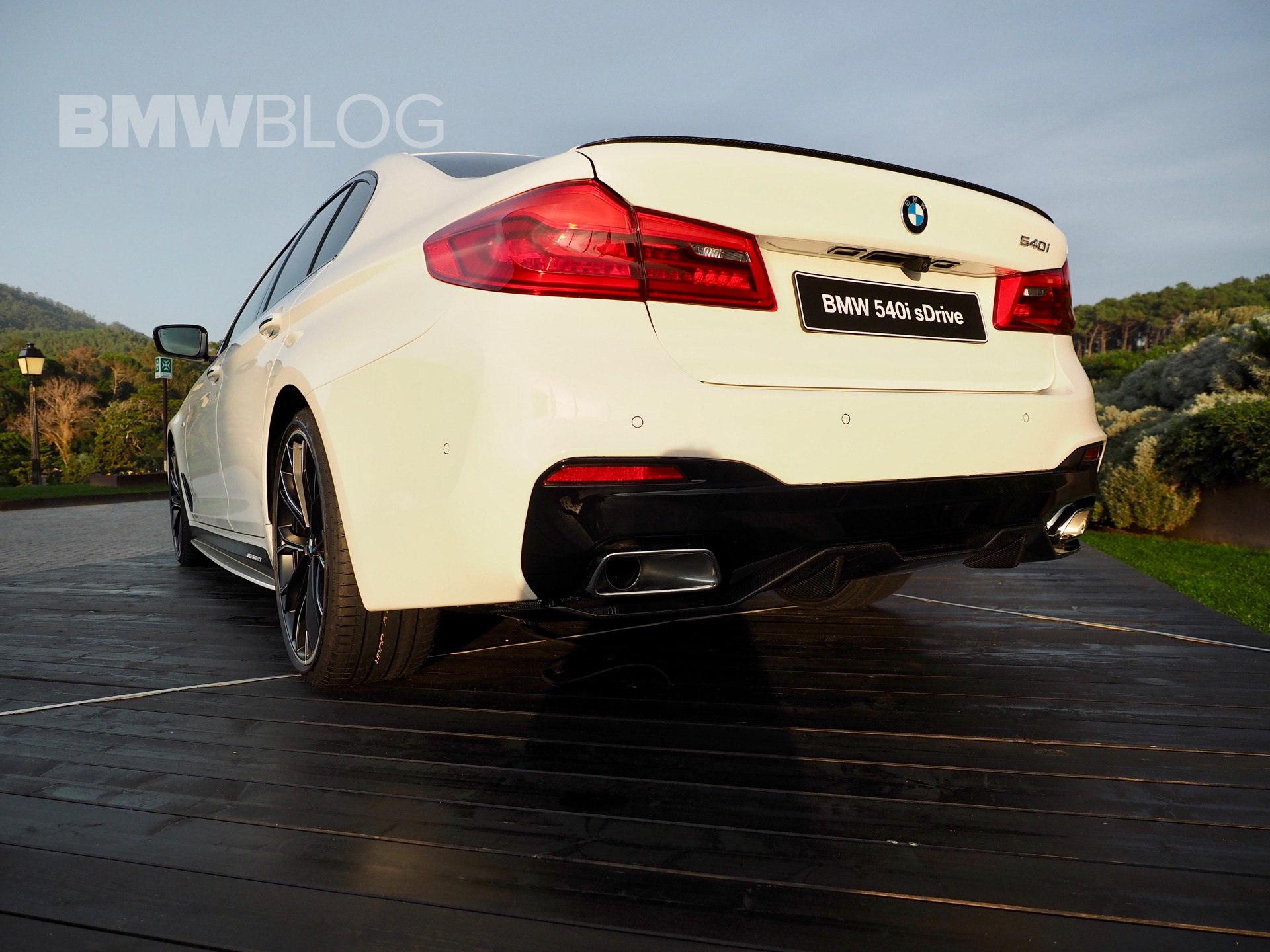 The sporty side skirts with the BMW M Performance lettering, the two-color rims, the rear spoiler lip and the diffuser insert for the M package rear apron are further differentiating the stock 540i from the ones tuned by M Performance.