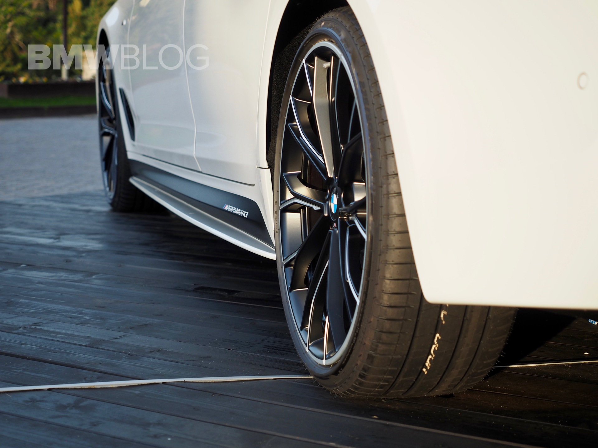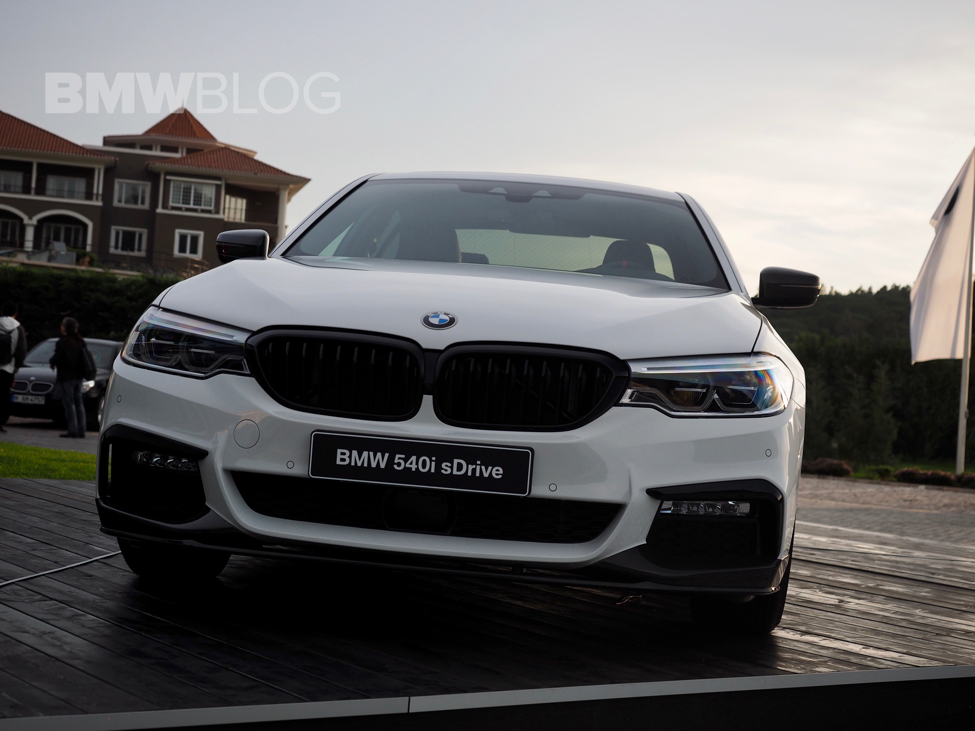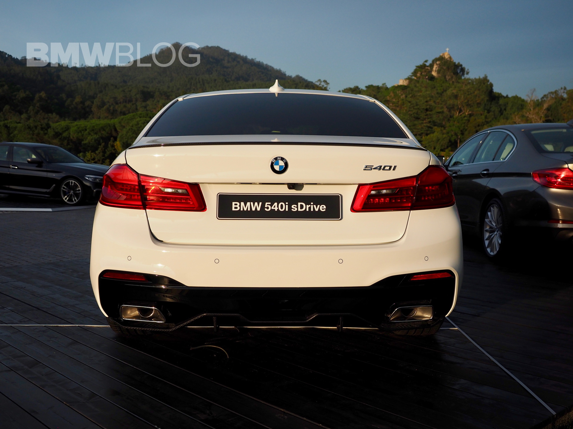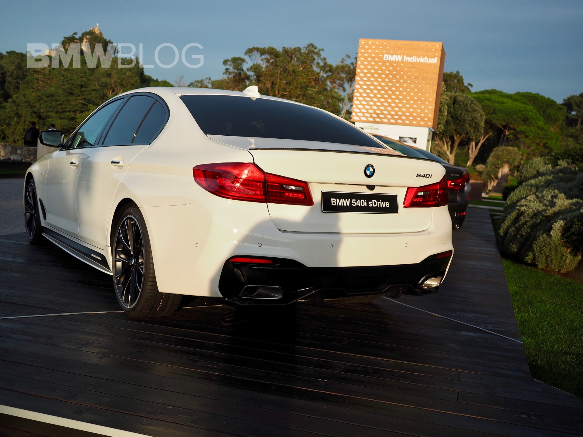 The sporty side skirts with the BMW M Performance lettering, the two-color rims, the rear spoiler lip and the diffuser insert for the M package rear apron are further differentiating the stock 540i from the ones tuned by M Performance.