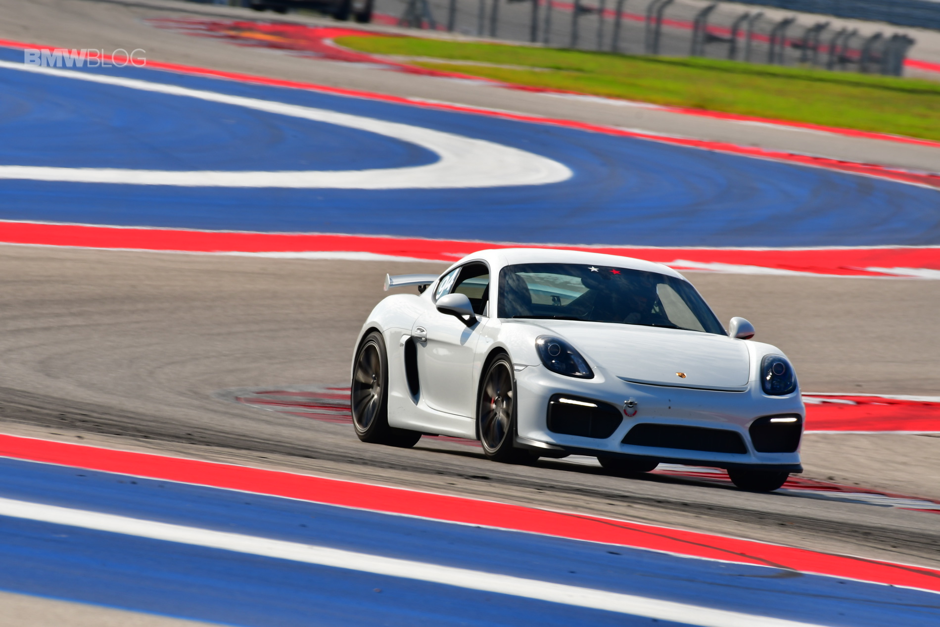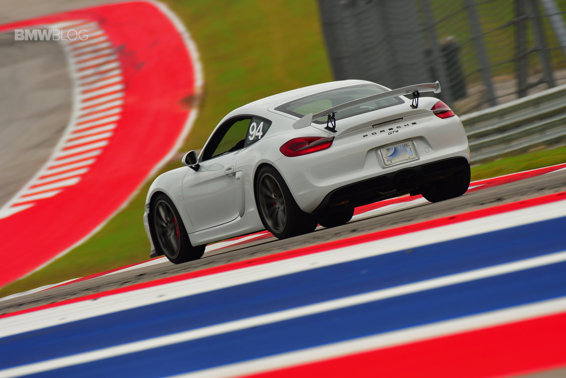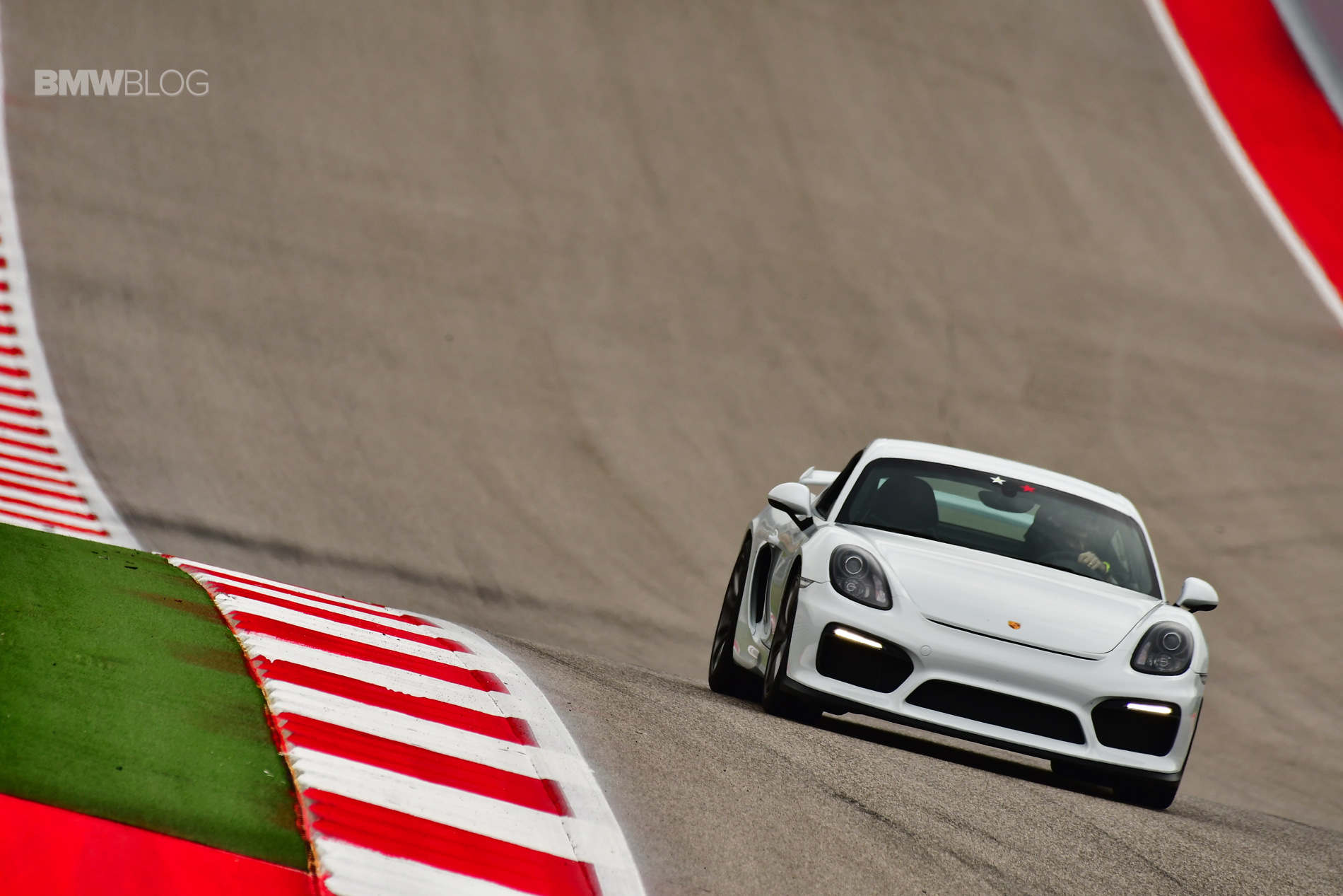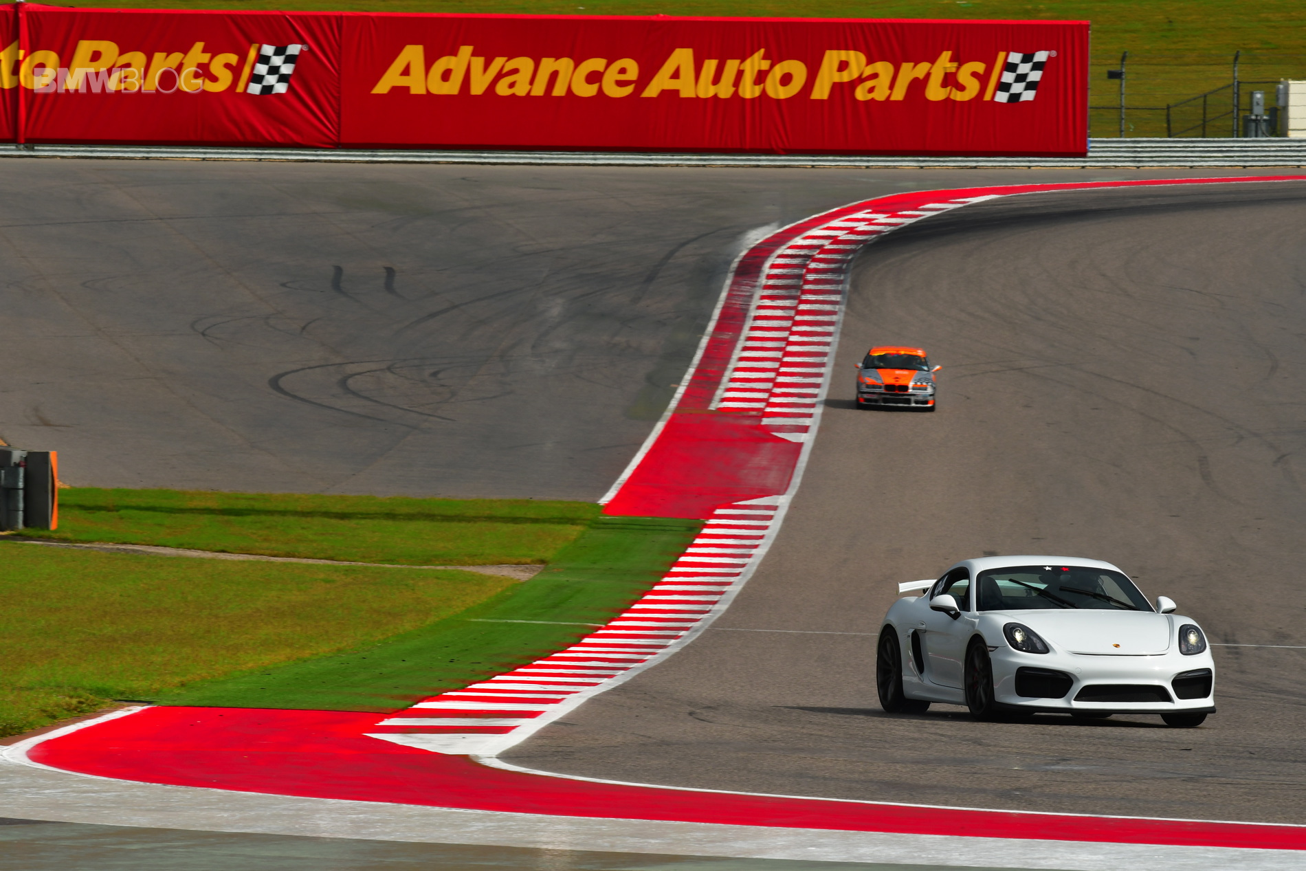 The GT4 comes from the factory fully adjustable suspension. Since there is some understeer as it comes from the factory, we dialed it down by setting the rear sway bar to full stiff. We also adjusted the rear spoiler on the GT4 from 4.5 to its maximum of 7 degrees on the rear spoiler and removed the front end underbody blocks, which according to Porsche balances the aero across the whole car. At speed, the aero on the GT4 adds 100 kg or 220 lbs of down force. This was very noticeable in high speed turns such as turn 10 at COTA. Being mid-engined, you can even get some power on oversteer with the car, as I noted once going tail out through turn nine at COTA. I did note that in the GT4 you cannot get on the power as early as you can a 911. Overall, I found it easier to drive the mid-engined GT4 fast than a 911’s rear engine where you really have to manage the 911s weight.