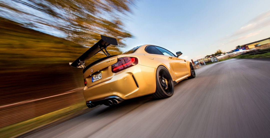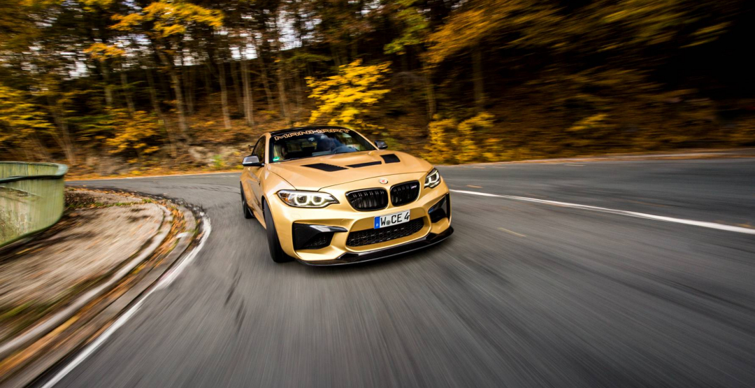 Manhart presents their interpretation of the M2 in a gold color, specifically in the BMW Individual color “Sunburst Gold Metallic”. Since the interior of the Manhart racing cars are presented in a typical Manhart design customization, the exterior color matches perfectly with the yellow accents inside the car, like an alcantara stering wheel and Recaro Sportster CS Seats.