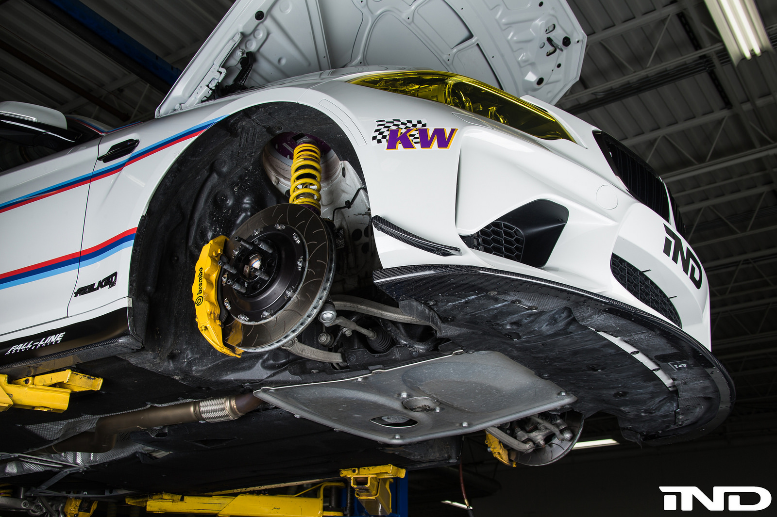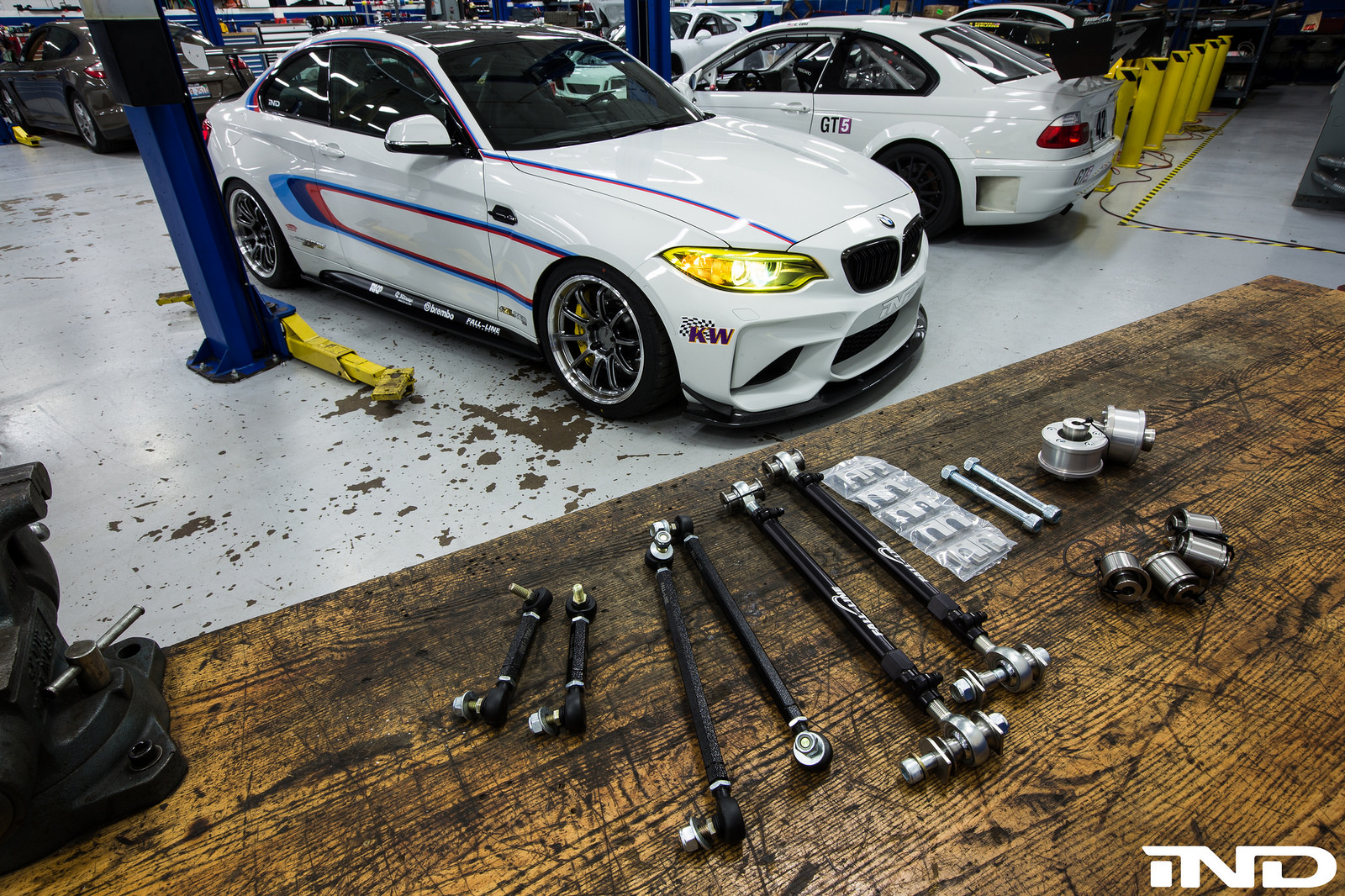 IND’s M2 has been transformed once more, this time featuring a simpler “street” look that shows the extent of chassis tuning possible while maintaining an appearance that one can live with every single day. IND began by working with Fall Line Motorsports to install the full Fall Line suspension component catalog. Front spherical bearings, rear toe adjustment arms, camber shims, rear upper control arm spherical bearings, and adjustable sway bar end links all made their way under the M2.