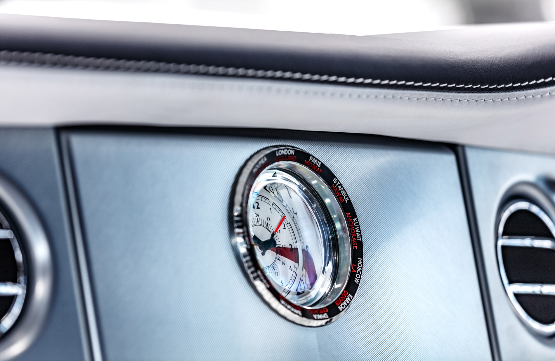 In true Phantom style, every possible detail has been considered. The clocks, featured in both the front cabin and the partition wall have been designed to echo the style of the radio clocks that adorned grand ocean liners. The Bezel, expressing 24 time zones, sits proud of the main clock, and reminiscent of HG Well’s time machine, allows the owner to rotate it in either direction depending on where they find themselves in the world.