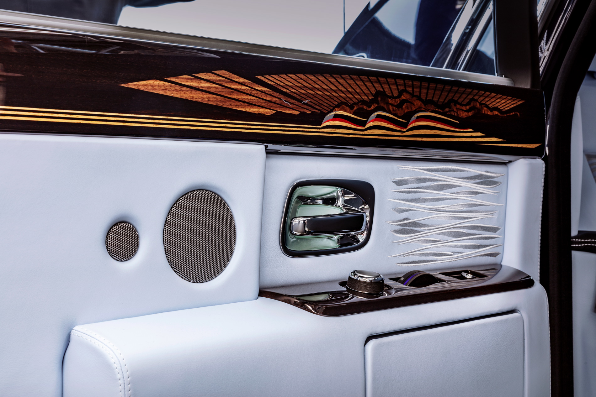The art of marquetry – so beautifully used throughout Phantom’s life – depicts a stylised 1930s ocean liner, reflecting this particular patron’s fascination with the design and iconography of this grand era. The nautical theme continues with the application of tone-on-tone embroidery evoking the movement of the sea, exquisitely applied to the interior’s Powder Blue leather.