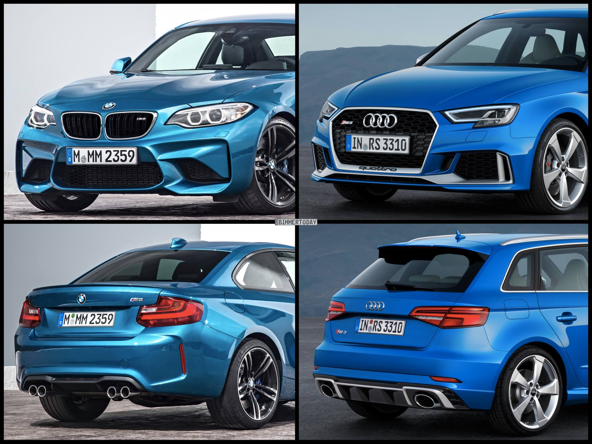 To be completely honest, I have a very hard time choosing between these two cars, in terms of looks. Both appeal to me, just in very different ways. The BMW M2 has an old-school, muscular coupe styling that reminds me of tire smoke and powersliding. While the Audi RS3 has a sort of techy-science look that’s really attractive to me. Both look angry and aggressive, but the M2 looks more muscular and the RS3 looks more high-tech. If I had to choose which looks better from the front, I’d have to say the Audi. I like its sharper lines and I like the “Quattro” badge in the front lip, which reminds me of the “Turbo” logo on the BMW 2002 Turbo back in the day.