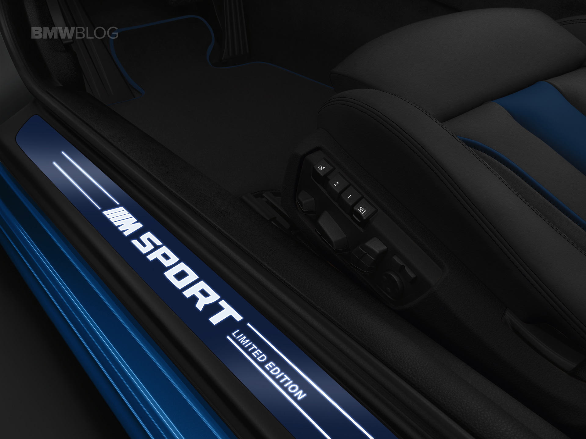 The M Sport Limited Edition also adds a distinctive touch of style on the inside. The driver and front passenger enjoy the characteristic driving experience on comfort seats with BMW Individual fine-grain Merino full leather trim in the variant Black/Fjord Blue. These seats are available exclusively for the edition models and are supplemented with floor mats featuring contrasting piping in Fjord Blue. The cabin is rounded off with interior trim finishers in carbon fiber, a gear selector lever with carbon fiber applications and door sill cover strips colored blue and bearing the inscription “M Sport Limited Edition”.