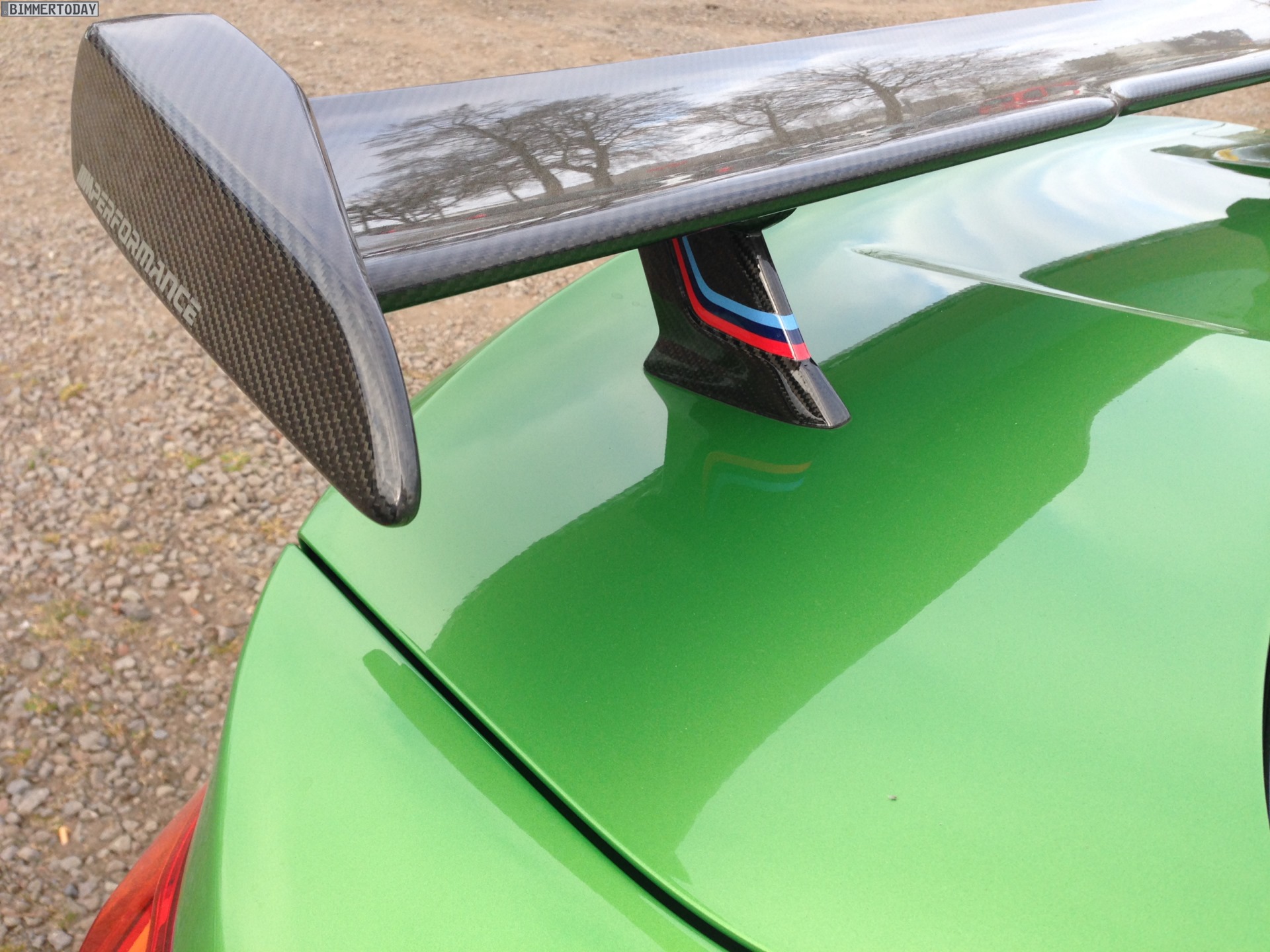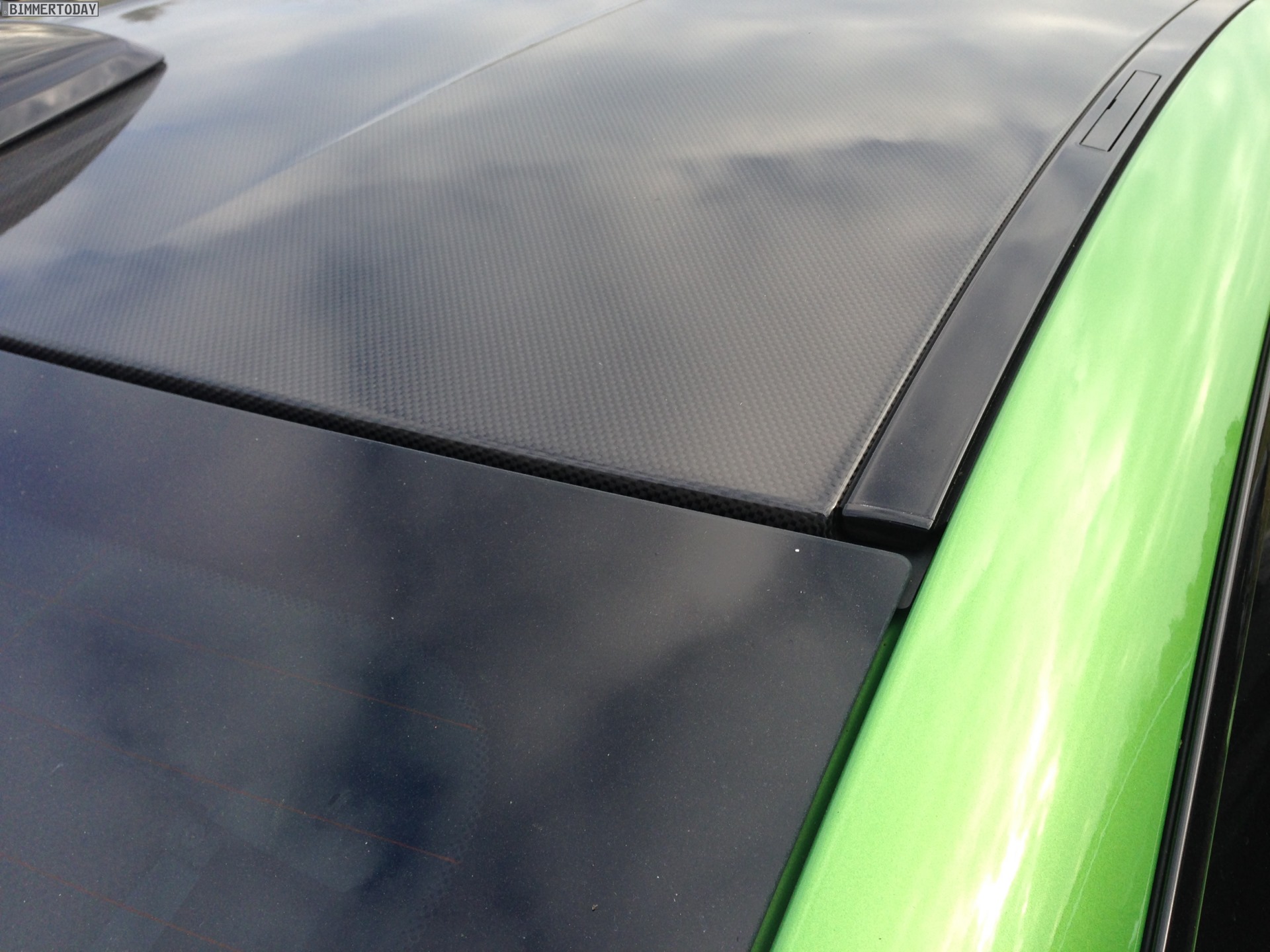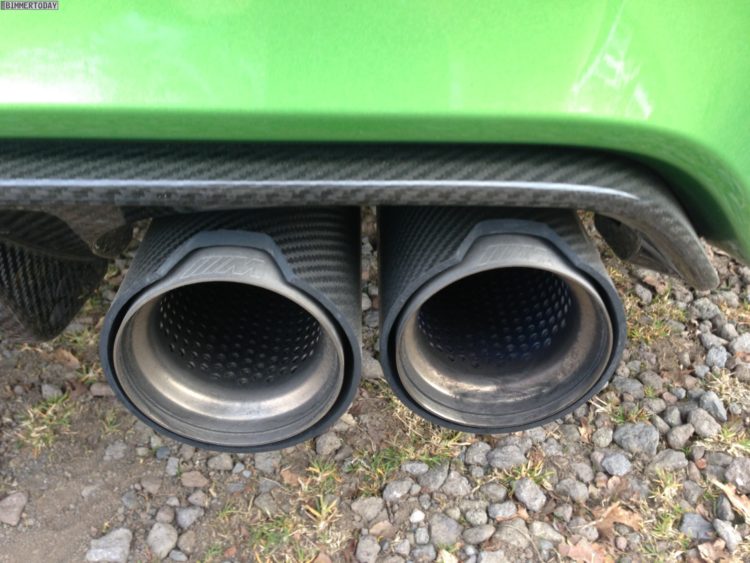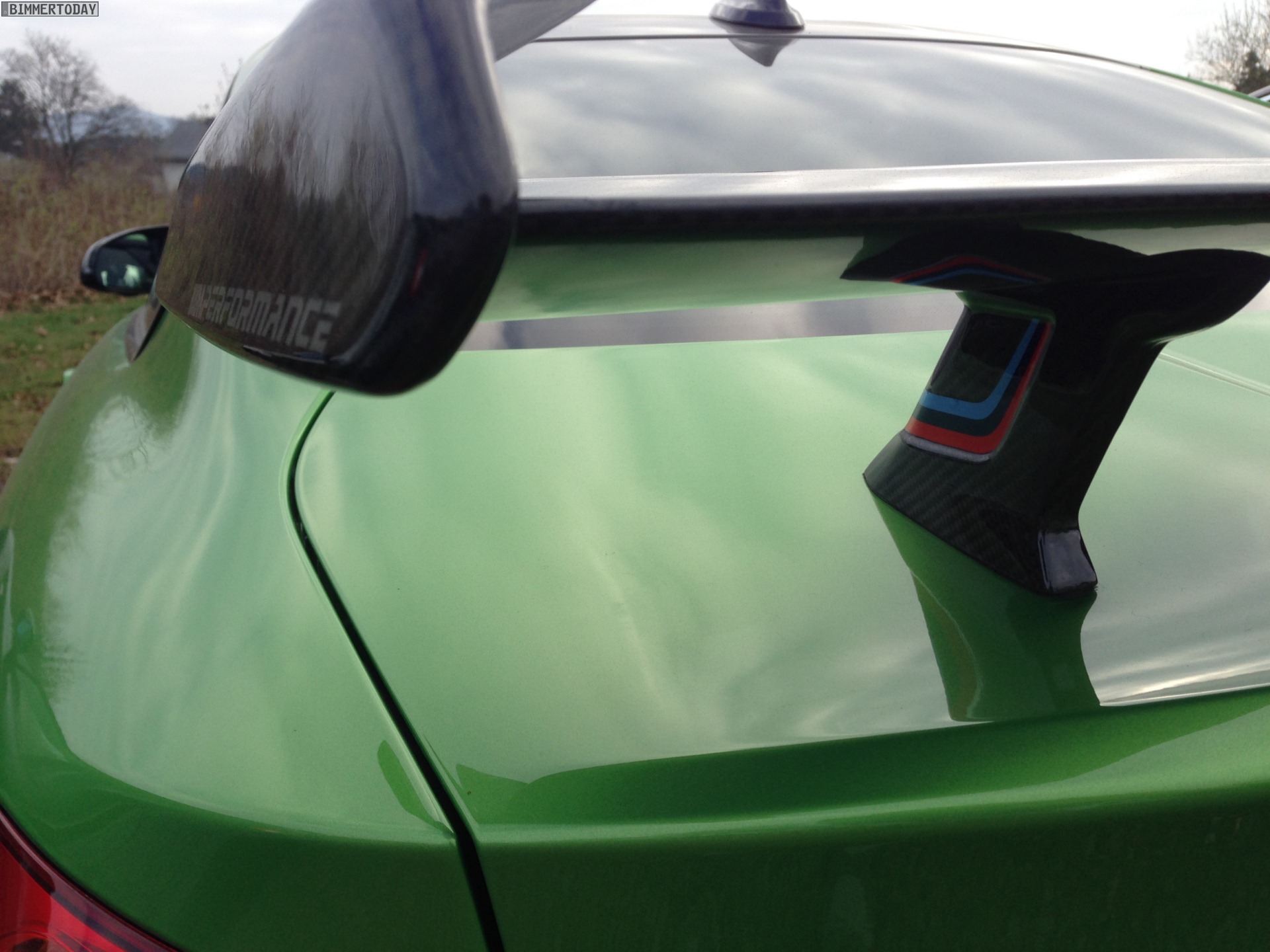 A few more dark accents can be found on the attachments made of carbon fiber: The attachment for the front apron is partly painted in Java Green, but partly also in exposed carbon. The lightweight carbon fiber composite is also seen on the roof, on the exterior mirrors, on the BMW M Performance rear wing, on the diffuser and on the tailpipes of the particularly loud performance exhaust system.