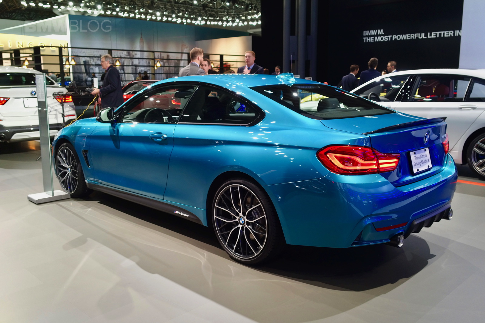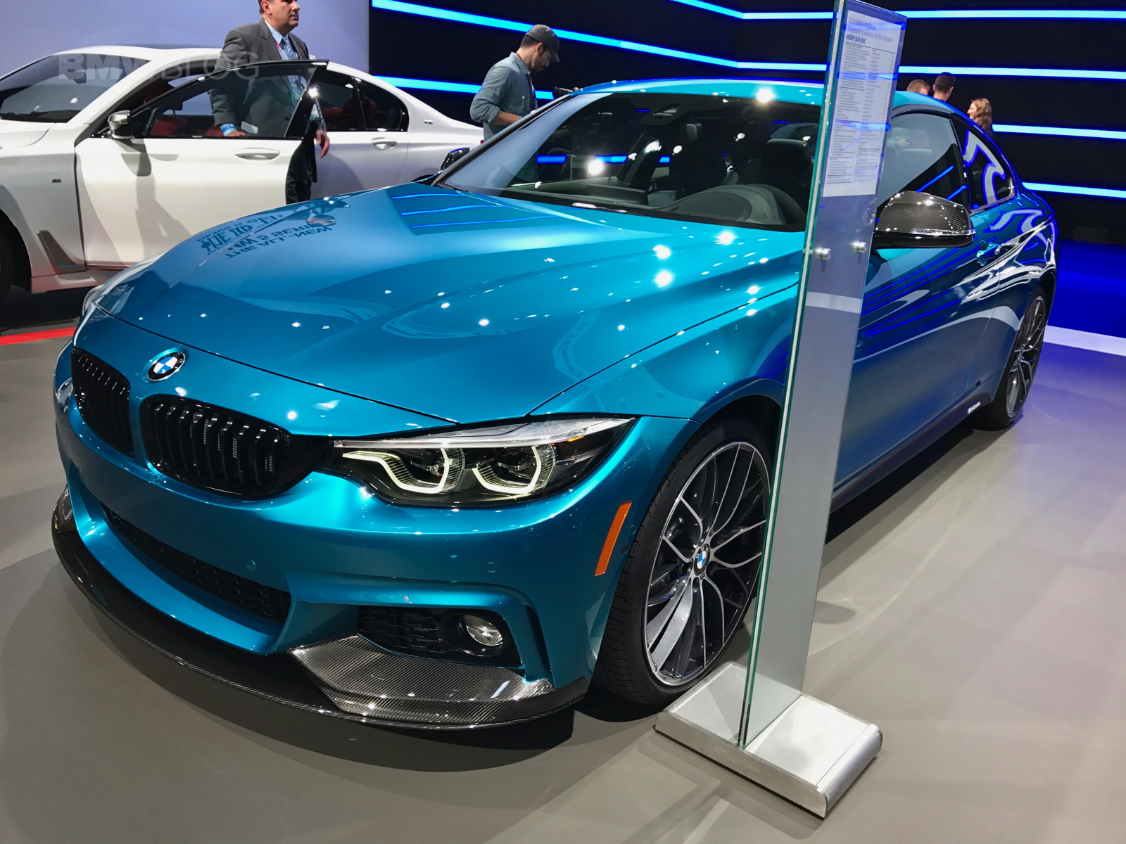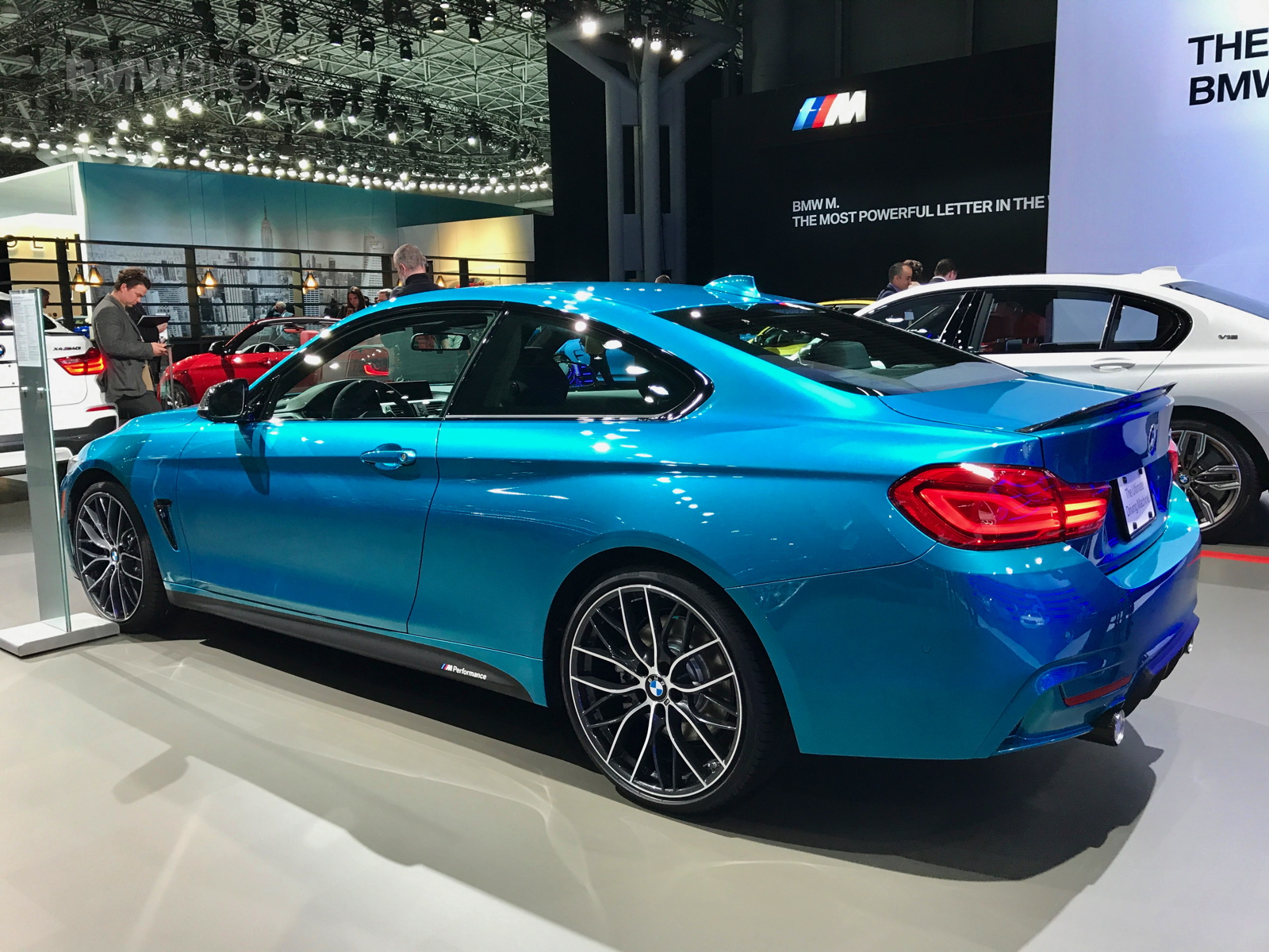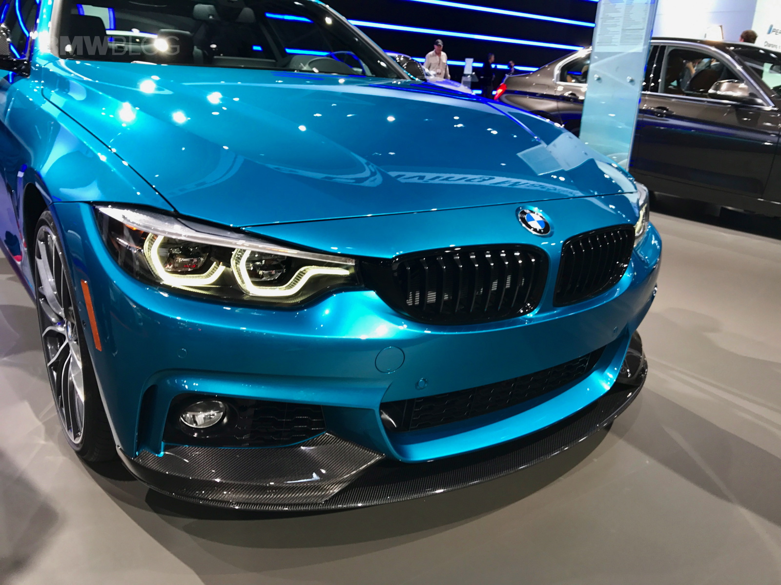 The facelifted BMW 4 Series shows up in New York this year with not only a refreshed design but also a new color – Snapper Rocks Blue. The turquoise blue color is featured by BMW on the top model 440i and it’s a head turner at the show. The 2017 BMW 4 Series Facelift focuses on lighting technology and interior changes, starting with the hexagonal daytime running light design, with hinged ridges, standard Bi-LED headlights; adaptive full-LED headlights with even better illumination of the street are offered for an extra charge.