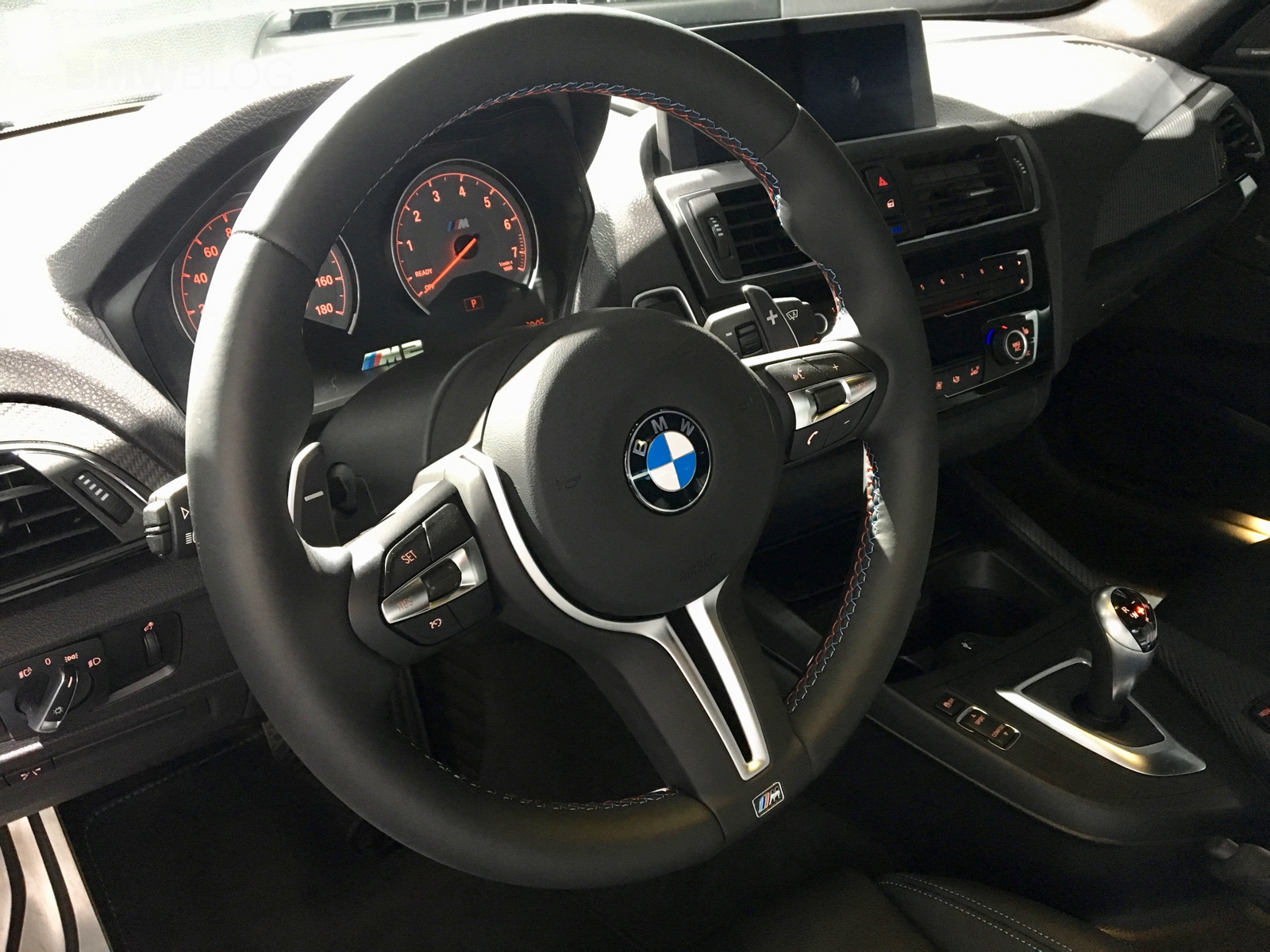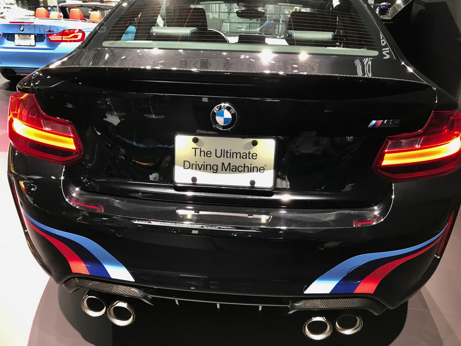 But on top of the wheels, this M2 is wearing its Black Sapphire Metallic paint and M Performance livery. I’m not so sure how I like the livery on the M2. The stripes down the sides of the car look fine and they look okay heading toward the exhaust at the back, but the stripes on the front air intakes look a bit silly and cheap. The M Performance exhaust tips look the business, though.