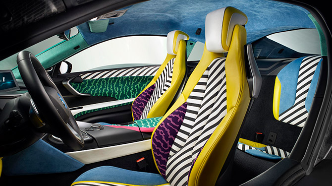 But what does MemphisStyle mean, exactly? The Memphis Group revolutionized the world of design by being an antithesis to functionalism and any commercial logic in the 1980s. Founded in 1981 by Ettore Sottsass Jr., the group’s style was provocative and inspired by movements like Art Deco with its geometrical shapes and Pop Art with its bright colors and Kitsch.  The BMW i8 MemphisStyle, thus, blazes in a colorful brightness with horizontal and vertical lines along with hypnotic patterns decorating the surface. Those contrasts display the pure expression of rebellion and liberation from the rigid standards of traditional design.