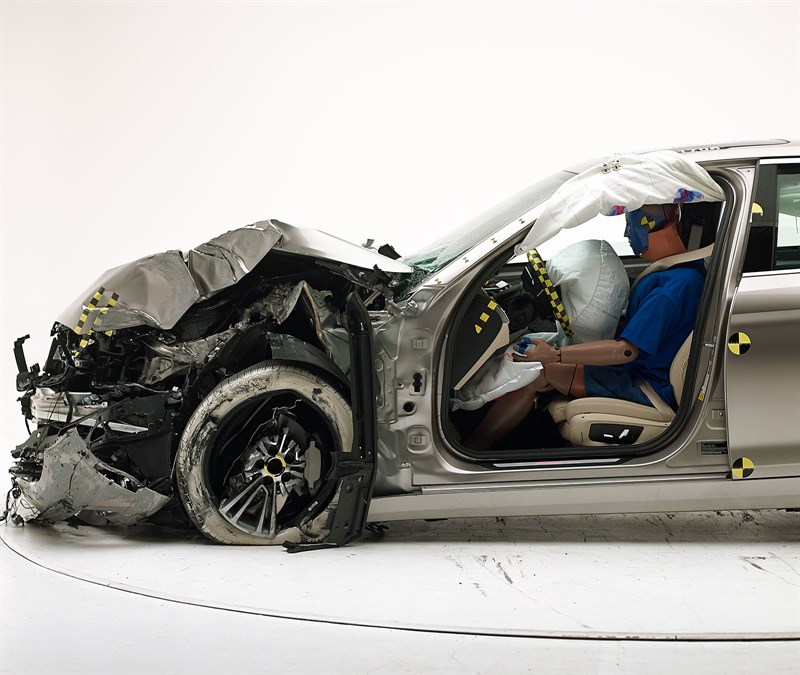 One of the most important aspects of the IIHS’ tests is the front overlap crash test. Basically, if a car hits an object head-on but only connects on the outer edge of the front end, it will do the most damage, as there’s the least amount of structure there to lessen the impact. So the IIHS developed two tests, the “Small Overlap Front” and “Moderate Overlap Front”. The BMW 5 Series scored a “Good” rating in both, the highest rating possible. You can see the video of the small overlap front test below and watch as the 5 Series simply deflects the damage outward and pushes the car away from the impact, lessening the blow to the passengers. This is, of course, by design, as the front end is designed with crumple zones to deflect the energy out and away from the passengers in the event of an overlap crash.