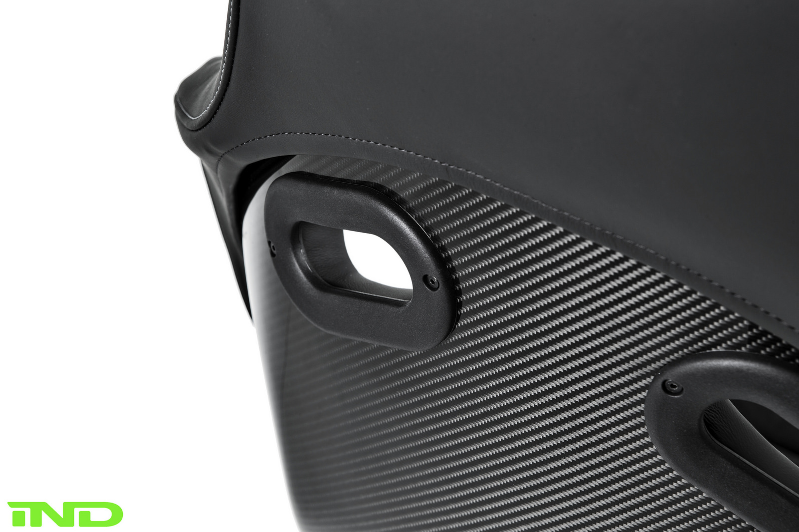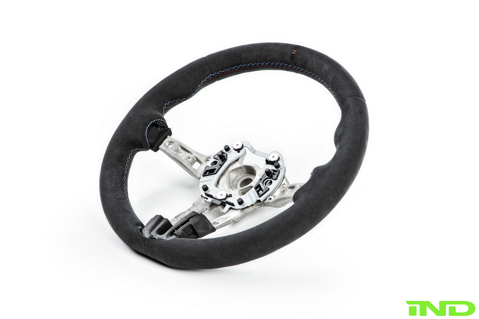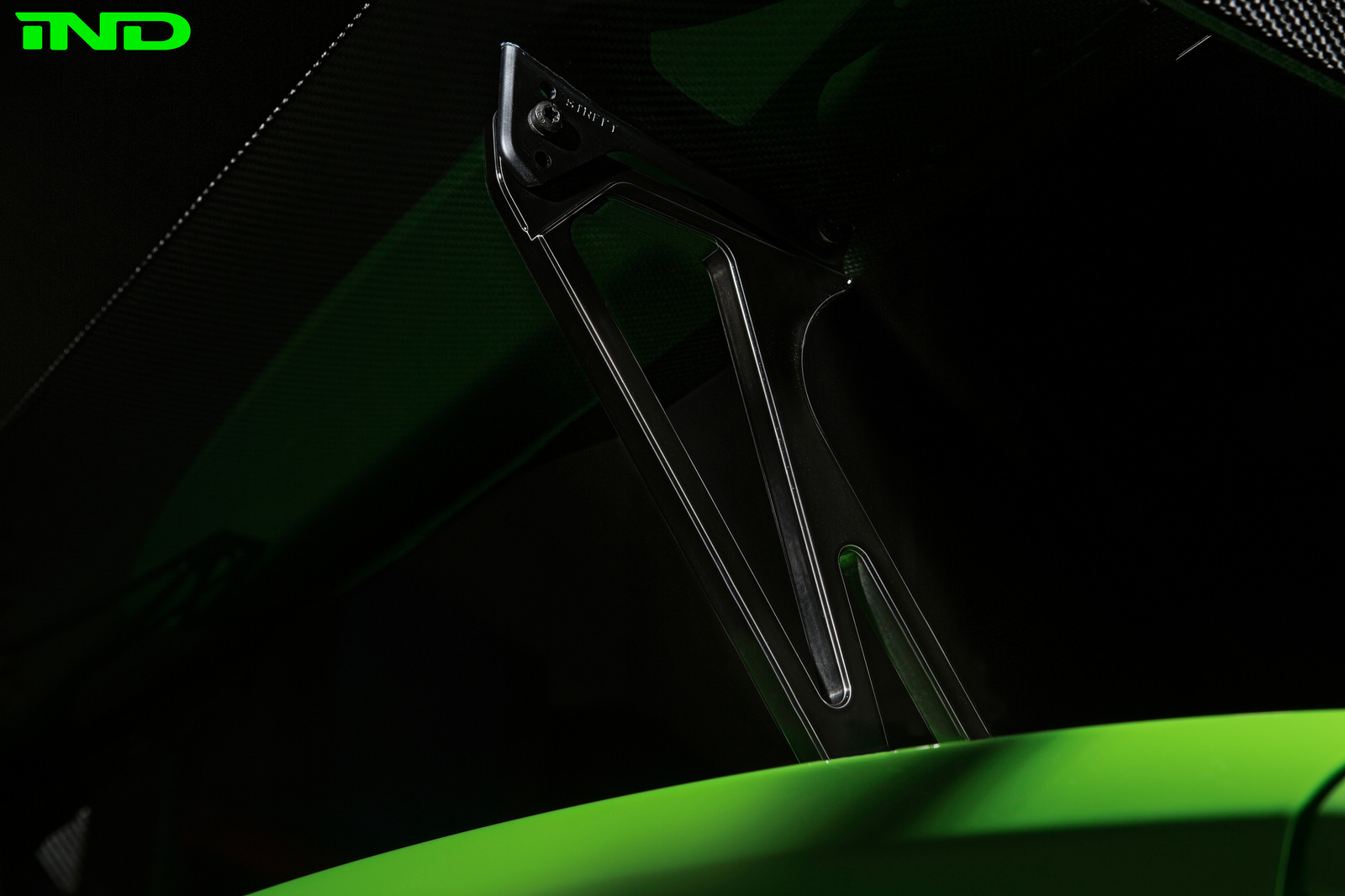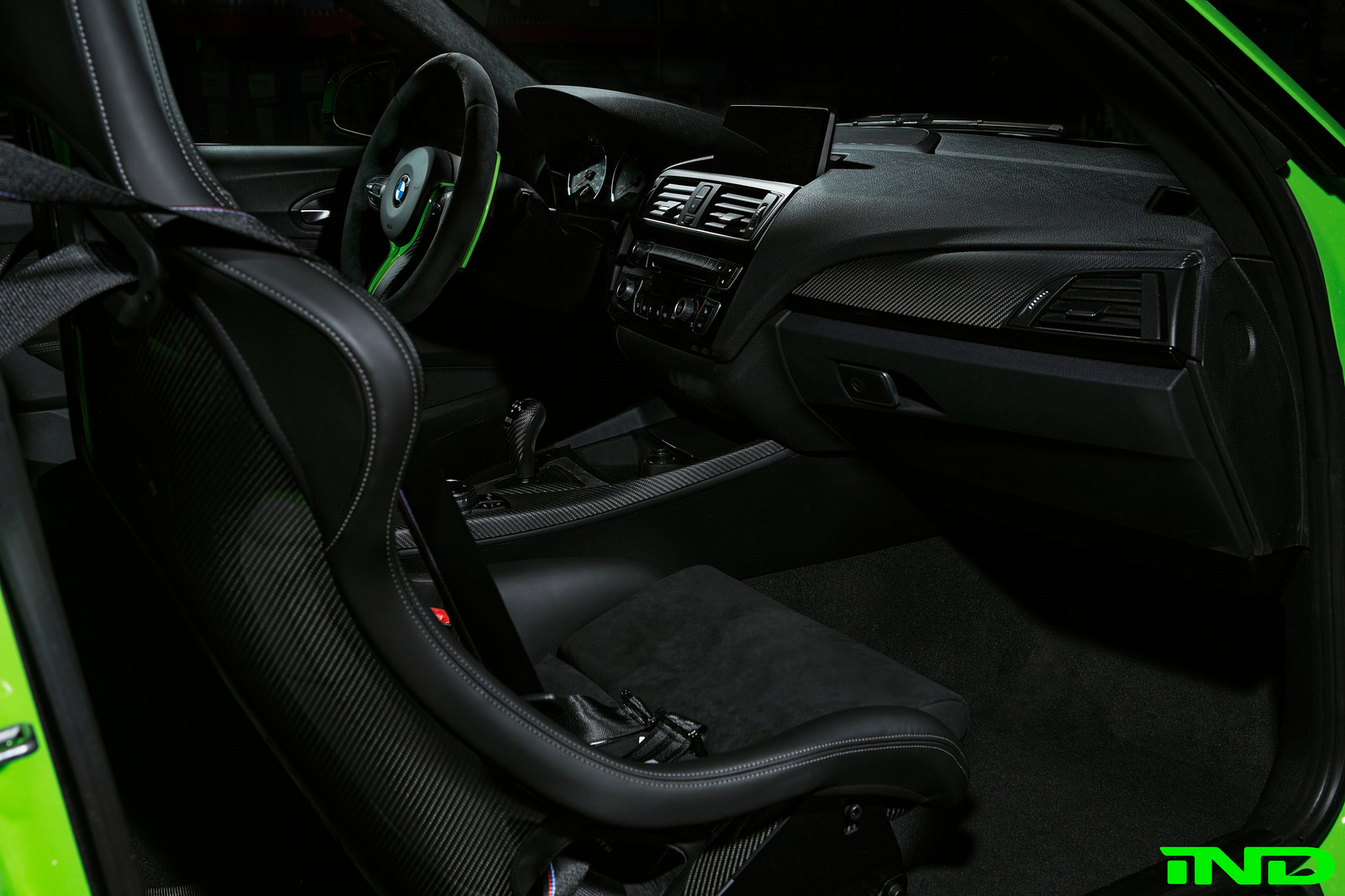 The M4 GTS steering wheel was a natural addition to the M2, integrating perfectly with BMW’s GTS seats. AutoTechnik shift paddles offer easier access to up and downshifts, and were refinished in GelbGrün to add subtle color to an otherwise relatively dark interior. The GTS fire extinguisher was also added to complete the GTS interior feel. IND removed all original blue stitch from the M2’s door panels, center console, parking brake boot, and floor mats to more easily integrate our own GelbGrün color.