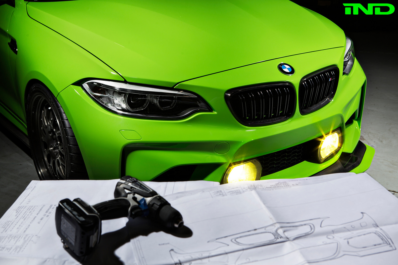 To complete the exterior of the car, IND directed their attention directly to the BMW Motorsport catalog, and got to work. M235R 24 hour foglights were a style centerpiece for this project. IND created custom carbon fiber fog light mounts in-house, and carefully positioned the fog lamps in the front bumper.