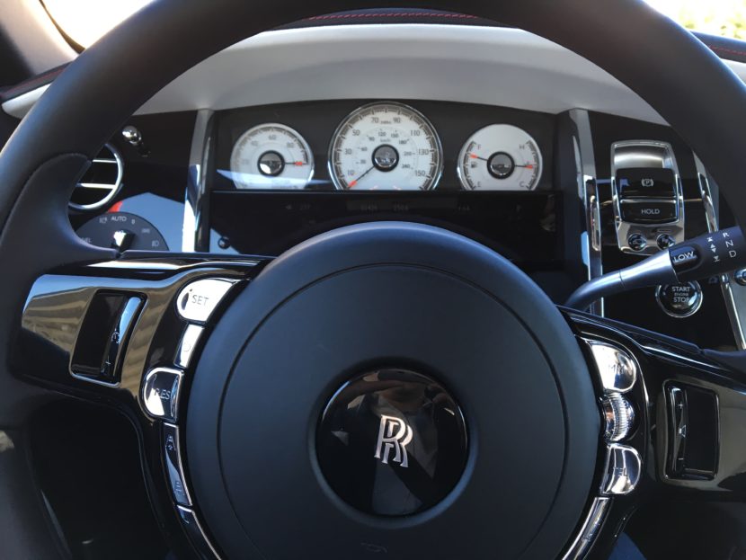 But better than that is how it drives. Full discretion, I thought the Wraith was going to drive like a big, squishy grand-tourer that’s incredibly comfortable to be in and ride in but boring to drive. I was very, very wrong. The steering is light but not as light as I had assumed. There’s actually some heft as you turn the wheel and the weighting builds nicely, giving the impression of feel, though there isn’t any. However, it’s accurate and places the front end as well as it can. While it’s not what I’d call sharp, front end is more accurate that you might imagine. It’s no Porsche 911 but it can be placed relatively where you want, which is impressive for such a big heavy car.