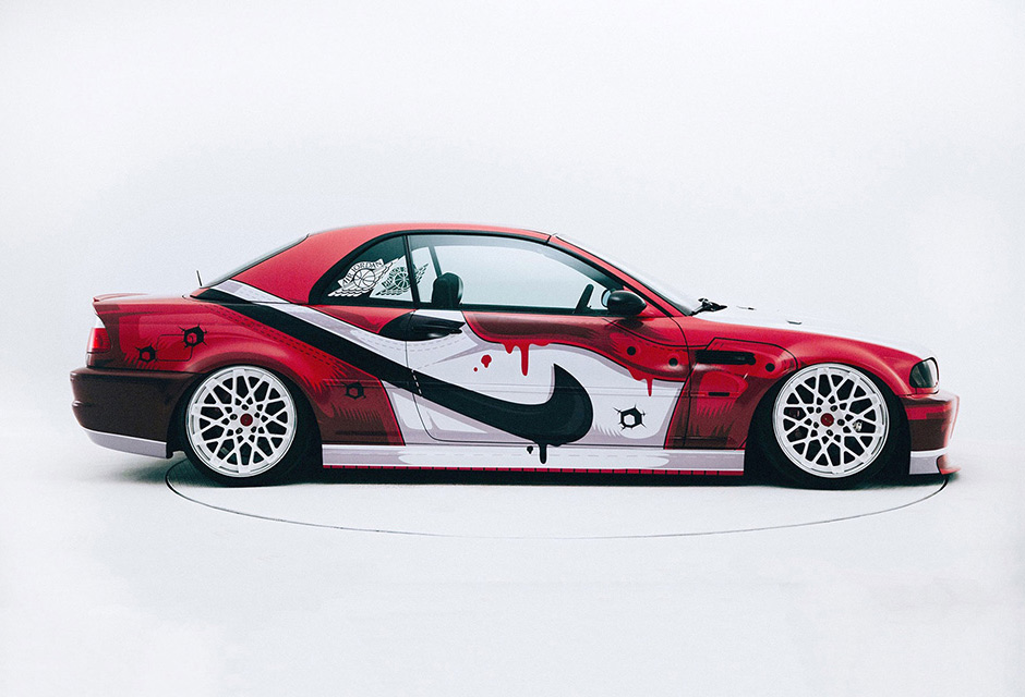 So it comes as no surprise that Beijing-based graffiti crew 400ML is taking its love of sneakers to greater heights with this BMW M3 designed after the Air Jordan 1. Featuring near spot-on details of the first-ever Air Jordan shoe in the iconic “Chicago” colorway as well as the crew’s signature detailing such as the melting paint and bullet holes, this BMW M3 was created by 400ML and car modifier brand iAcro for a special exhibit at Beijing The Palace Square from June 14th through the 18th.
