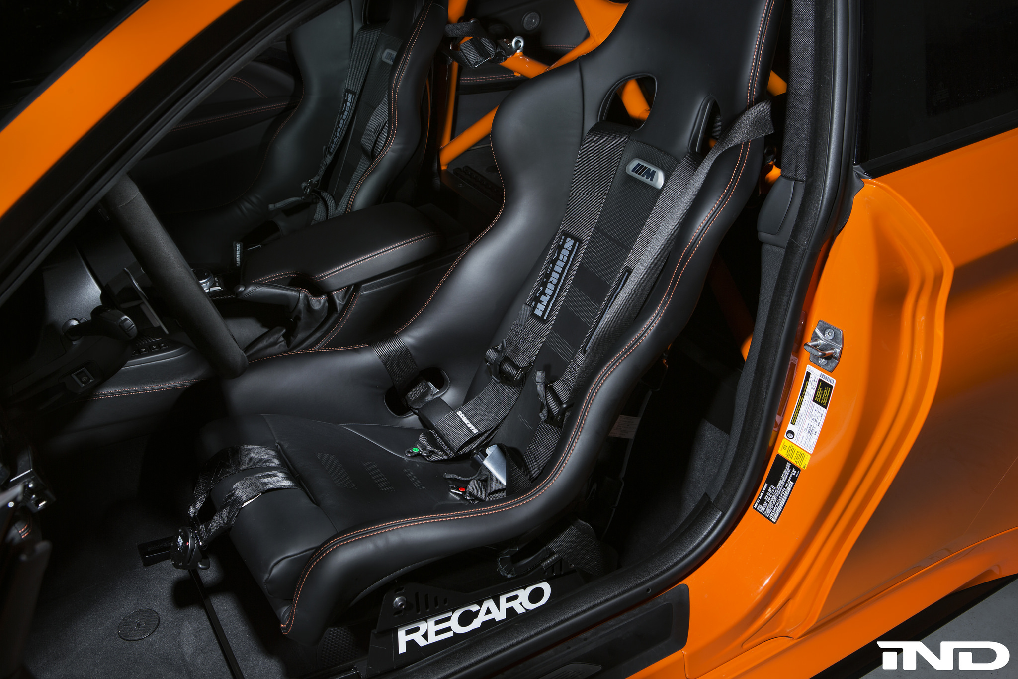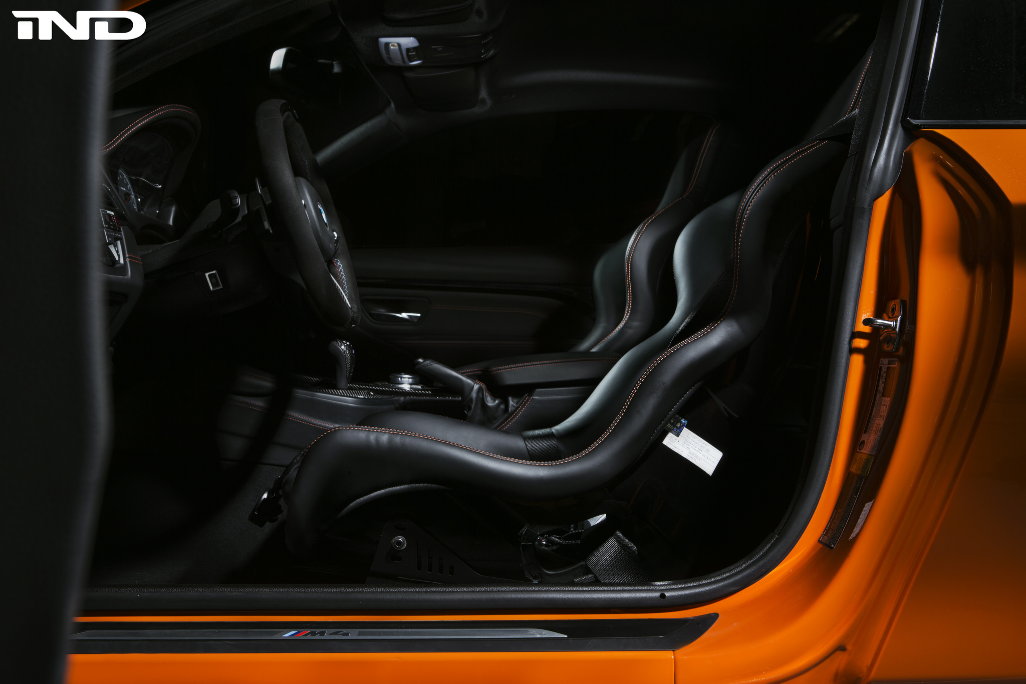 The next parts installed are the BMW M Performance front lip spoiler, rear diffuser and the iNDÂ gloss black kidney grilles and painted side markers, alongside the side gills. These parts add that perfect contrasting touch but also clean up the exterior colors of the vehicle. The interior of the vehicle also saw extensive work; the M4 seen here is equipped with a full roll cage, racing bucket seats, and seatbelts that ensure the safety of the car is further upgraded too.