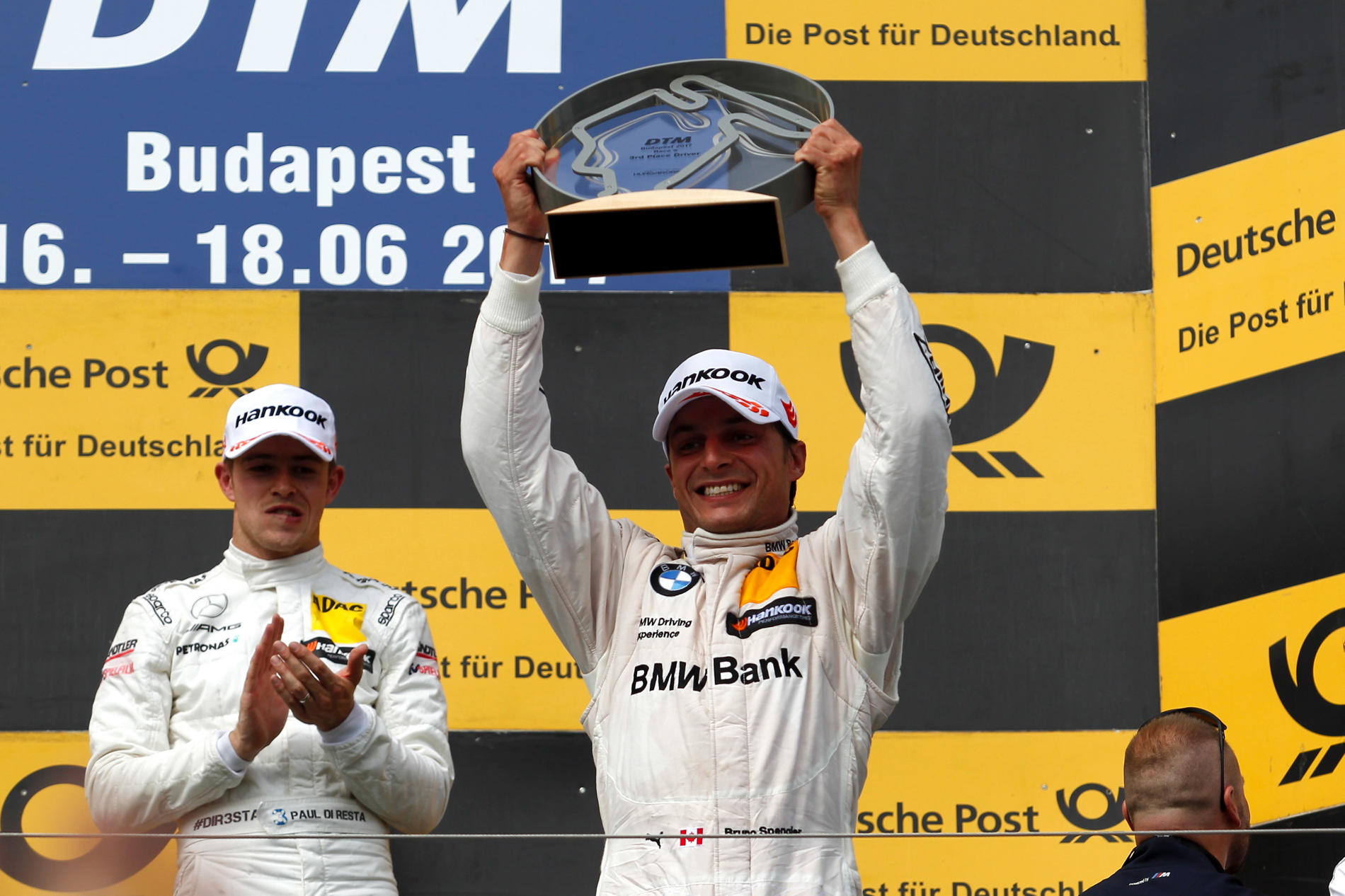 Timo Glock (#16, DEUTSCHE POST BMW M4 DTM – Grid position: 14th, race result: 2nd place – 61 races, 3 wins, 7 podiums, 2 pole positions, 256 points): “We didn’t expect to move up from 14th on the grid into second place today. No doubt it would have been difficult in normal circumstances. I wasn’t able to pass Marco at the start. I knew I was able to keep up with the pace, which is why I decided to stop. I didn’t have anything to lose. I was fortunate that the safety car came out two laps later and then, when it became clear that only Paul, Bruno and I had stopped, it seemed likely that I could be in with the chance of a podium. I am really happy with second place, but we are well aware that we need to improve in terms of speed in the second race.”