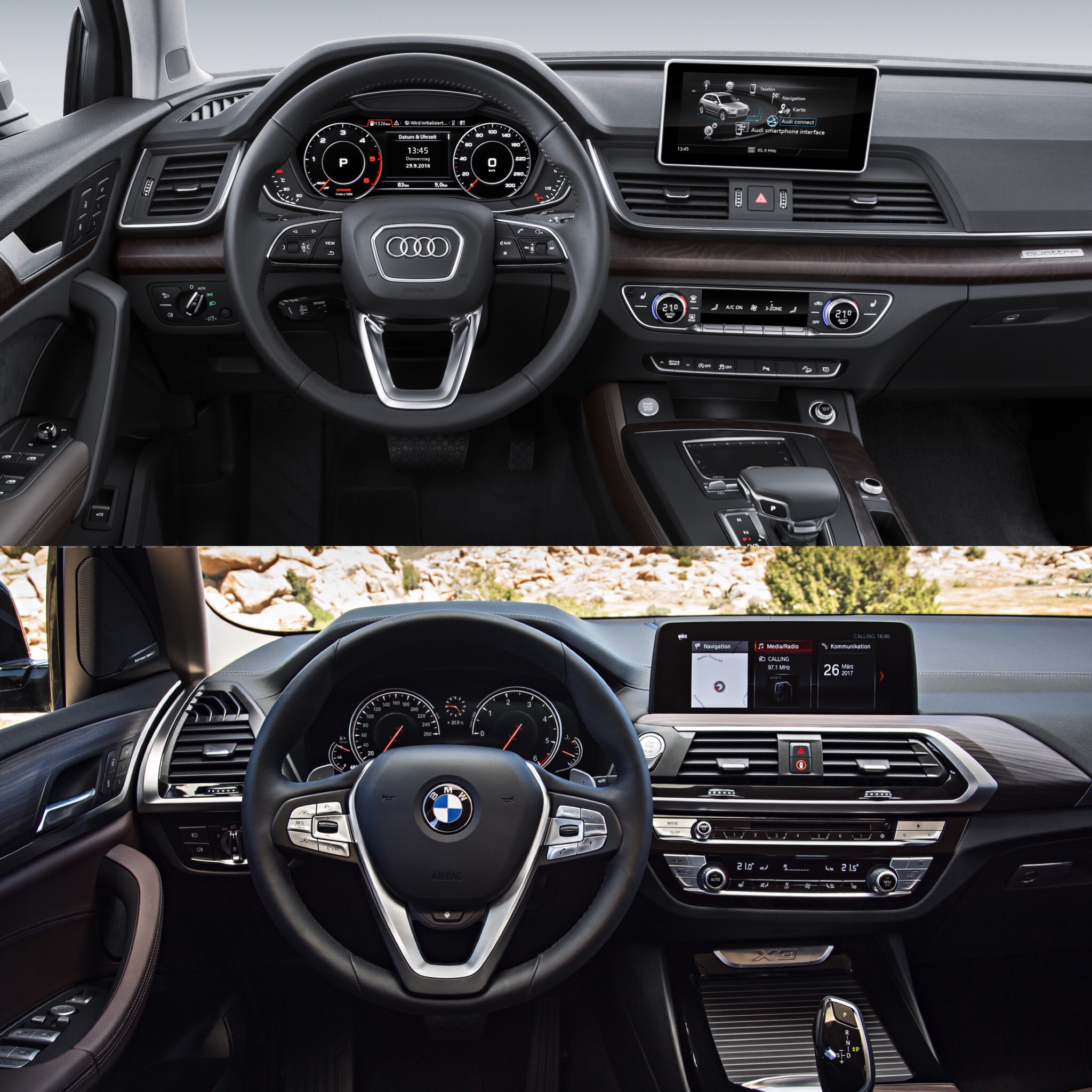 From the outside, it’s immediately obvious that the new BMW X3 is more muscular looking than the Audi Q5. The former has an aggressive shoulder line, muscular haunches and flared nostrils. It’s the angrier looking of the two cars. By comparison, the Audi Q5 is almost sterile. Though it has sharp, crisp and smart-looking lines and is attractive in its own right. It’s just no one near as aggressive or in-your-face as the new X3. BMW also seems to be pushing the idea that the new X3 is a pretty rugged car with some decent off-road capability, so it’s the more rugged-looking car of the two. It has a sort of Mad Max feel, especially in the pictures of it in the desert.