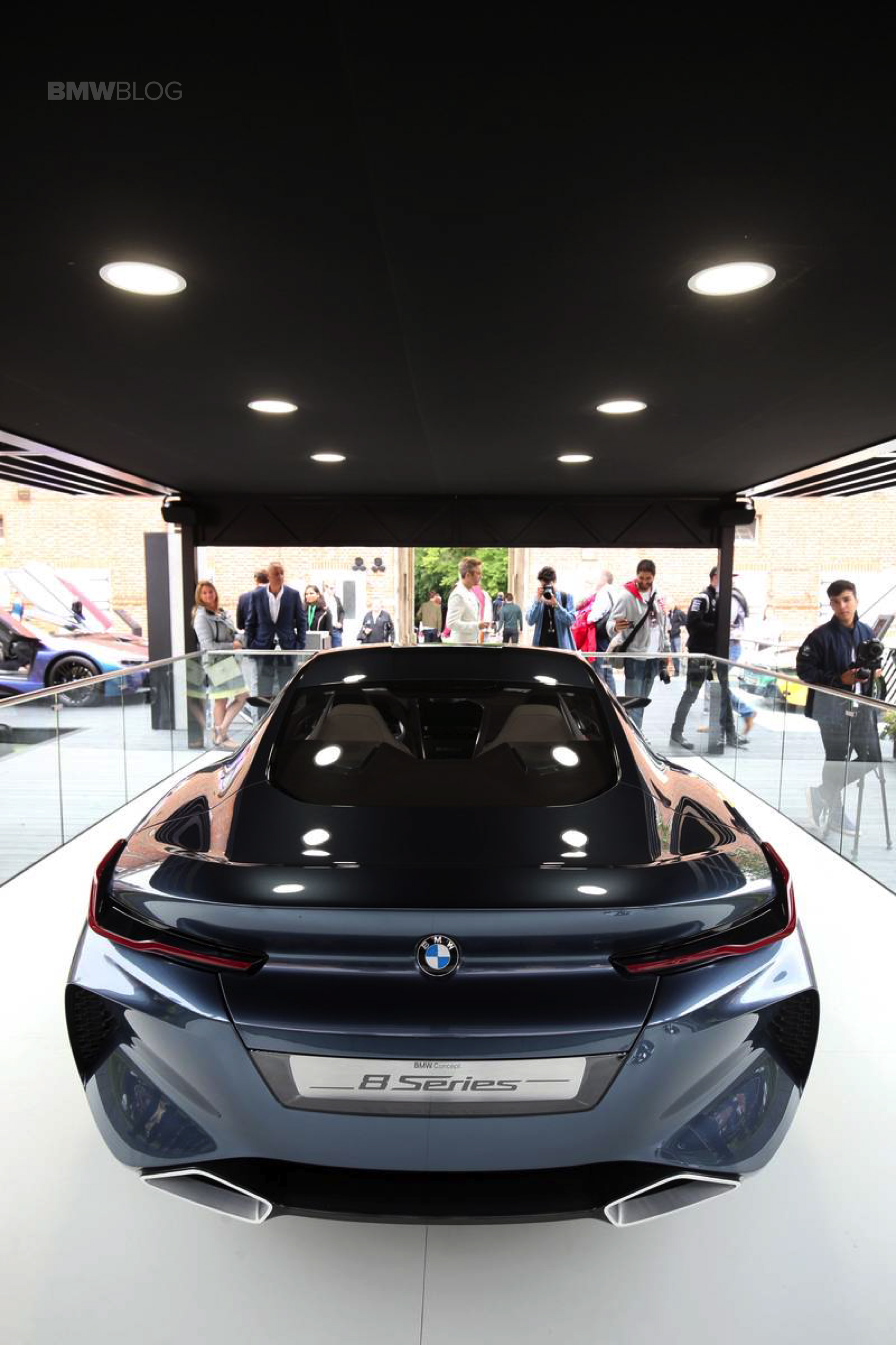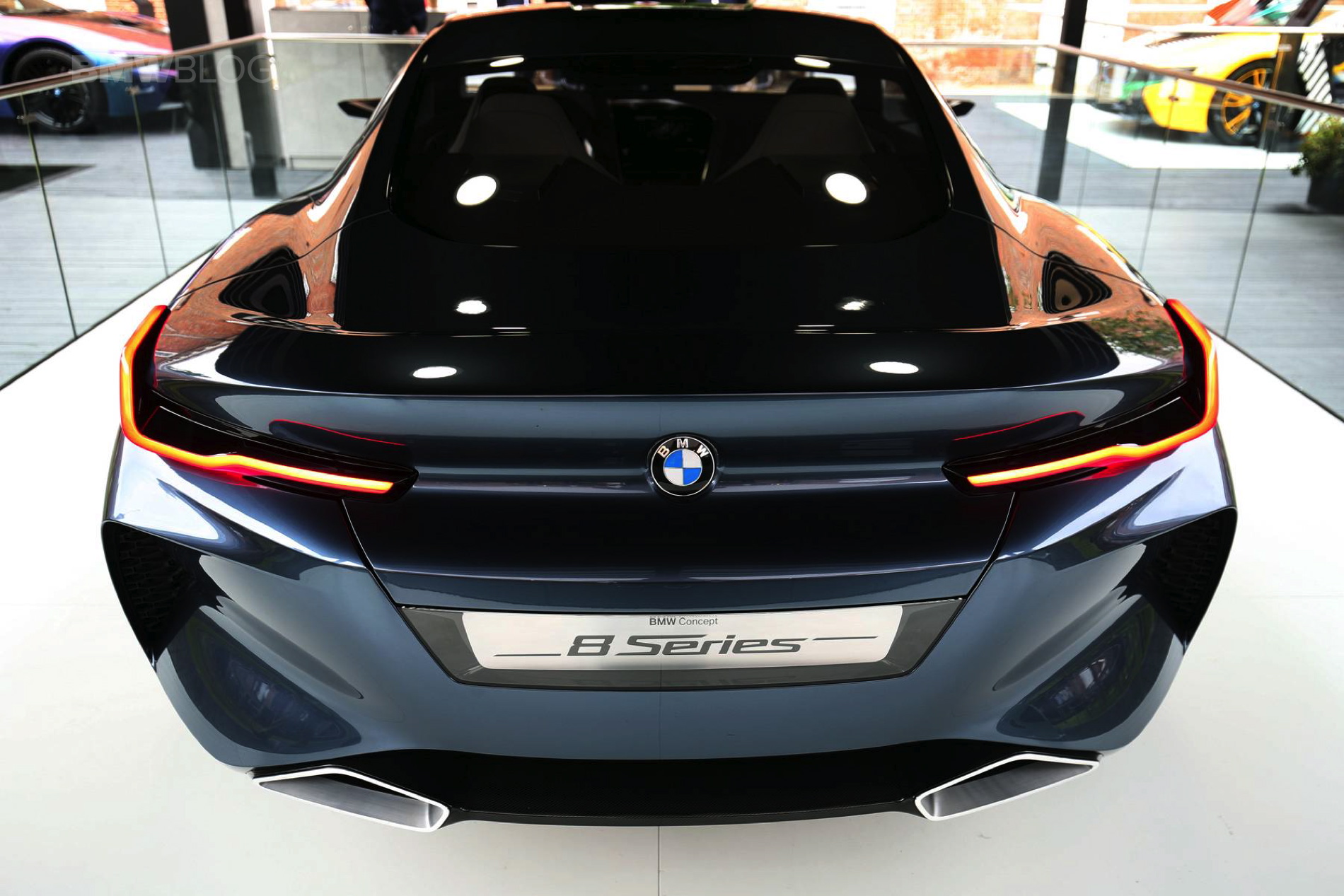 From the back, the Concept 8 Series looks particularly unique from other BMWs. One can easily sport the wide, horizontal taillights with L-shaped OLED elements, along with rear spoiler molded into the trunklid and trapezoidal exhaust tailpipes. A dark carbon-fiber diffuser can be found in the lower section of the rear apron.