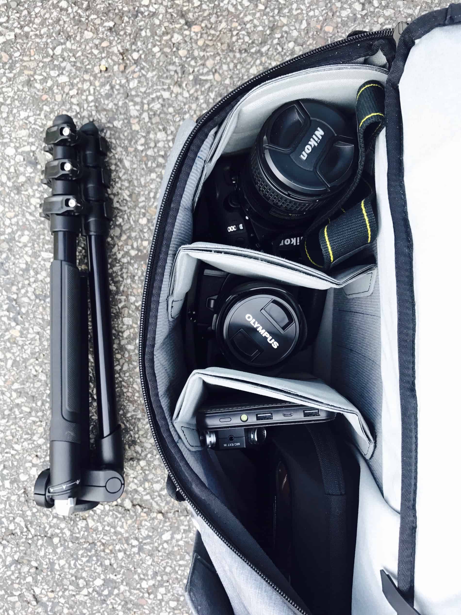 At this size, I can comfortably carry a MacBook Pro 13 inch (can fit up to 15 inch laptop), an iPad Air, an Olympus OEM-D1 mirrorless camera, a Nikon D7000 DSLR with a wide lens, a DXONE camera, a USB battery pack, an audio recorder, a variety of chargers, adapters and cables, a Zhiyun Smooth 3 Gimbal, a pair of Bose headphones, sunglasses, pens, drugs of the legal kind, wallet and water bottle. Yes, that’s what a car journalist has to haul around to get the job done.