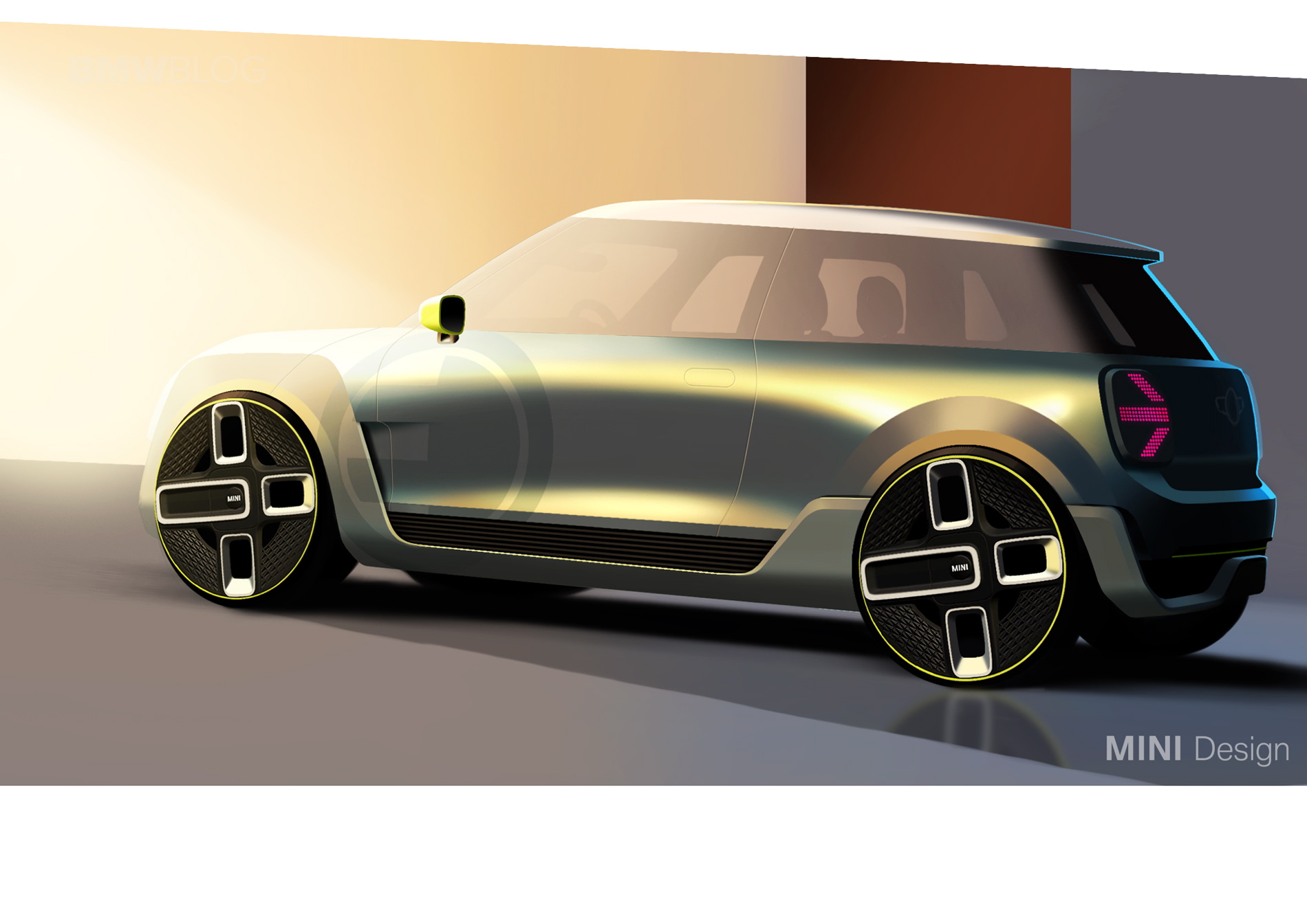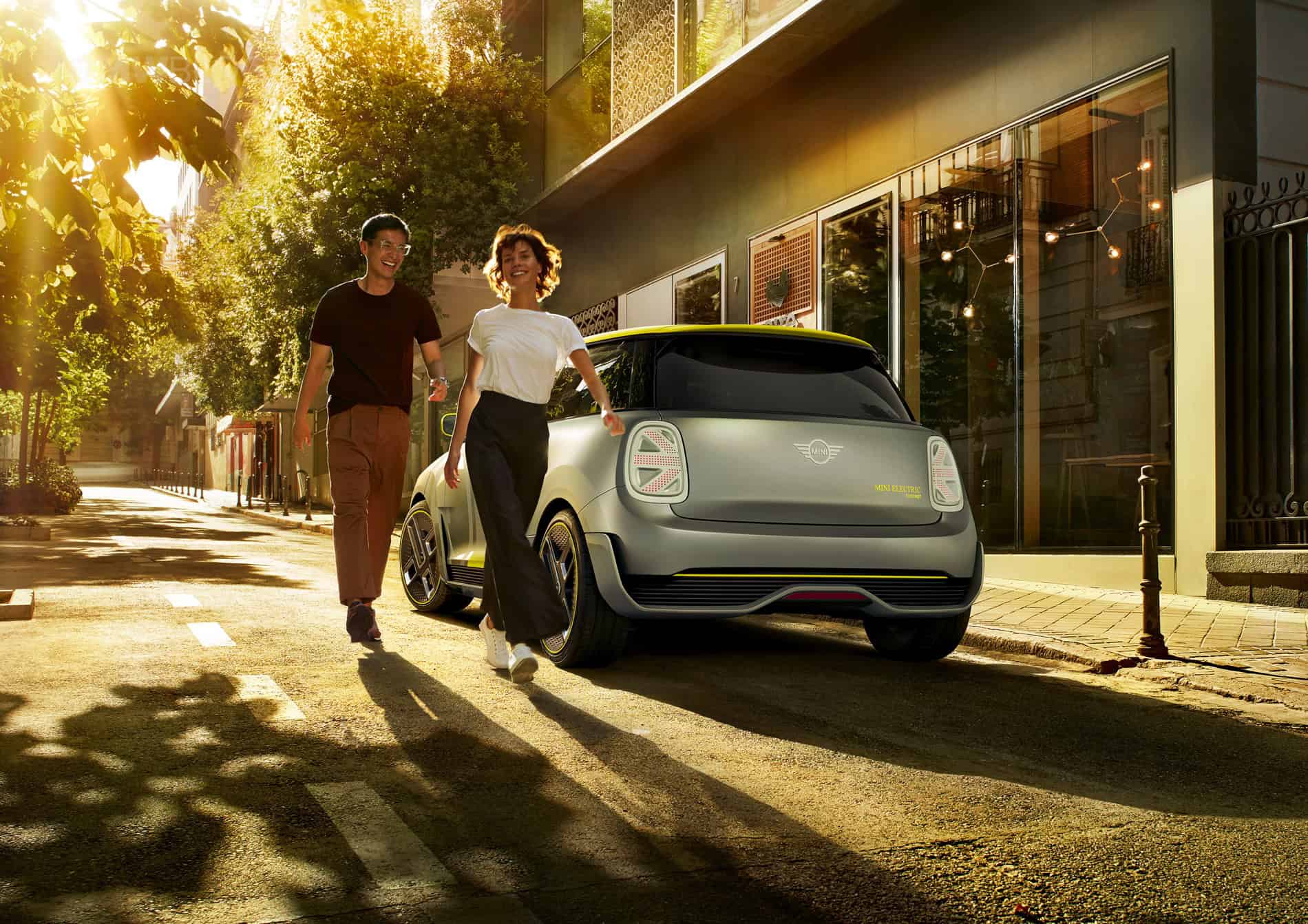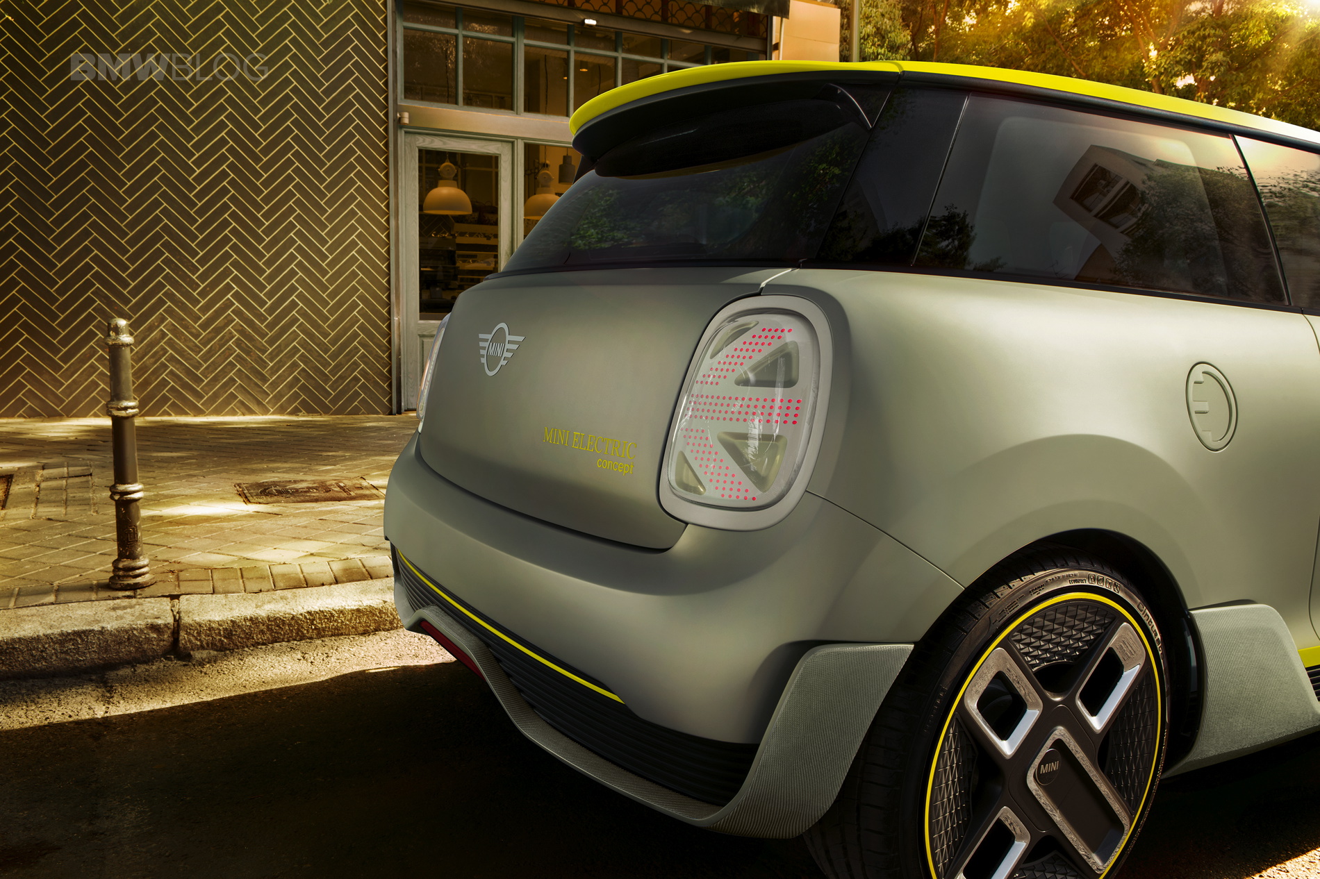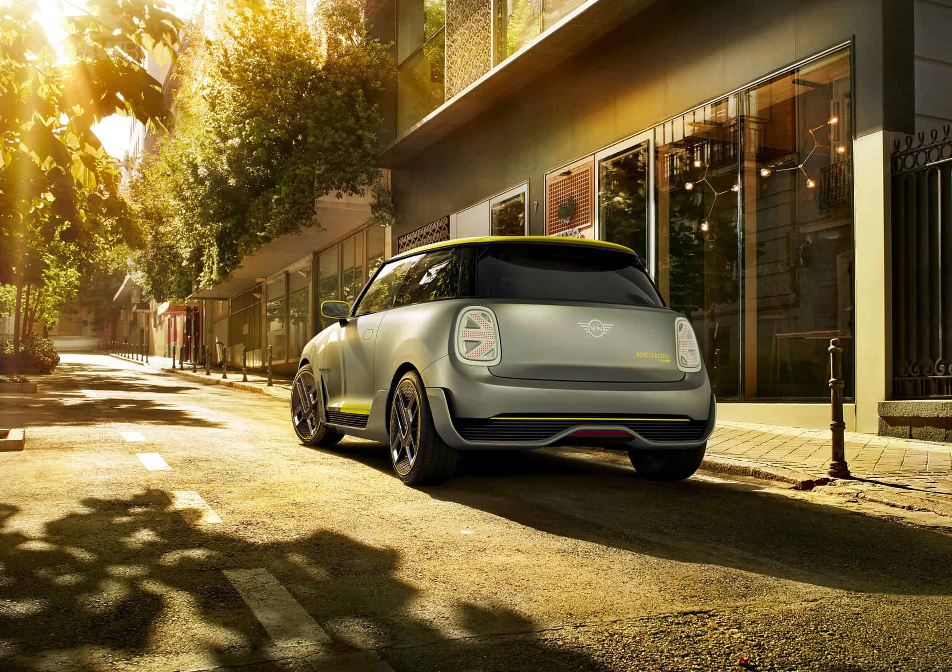 The design of the MINI Electric Concept stands out with a hexagonal radiator grille and circular headlights. Identifying features include the vividly contrasting silver and yellow colour scheme reminiscent of the earlier MINI E, as well as the distinctive E badge. Besides this, the radiator grille and headlights have been reinterpreted to reflect the emission-free drive technology under the bonnet. As the electric drive unit requires very little cooling air, the radiator grille is closed for superior aerodynamics. A Striking Yellow accent bar in the grille – with an E badge in the same colour – produces a powerful contrasting effect, which is echoed by the styling of the daytime running lights in the all-LED headlight assemblies.