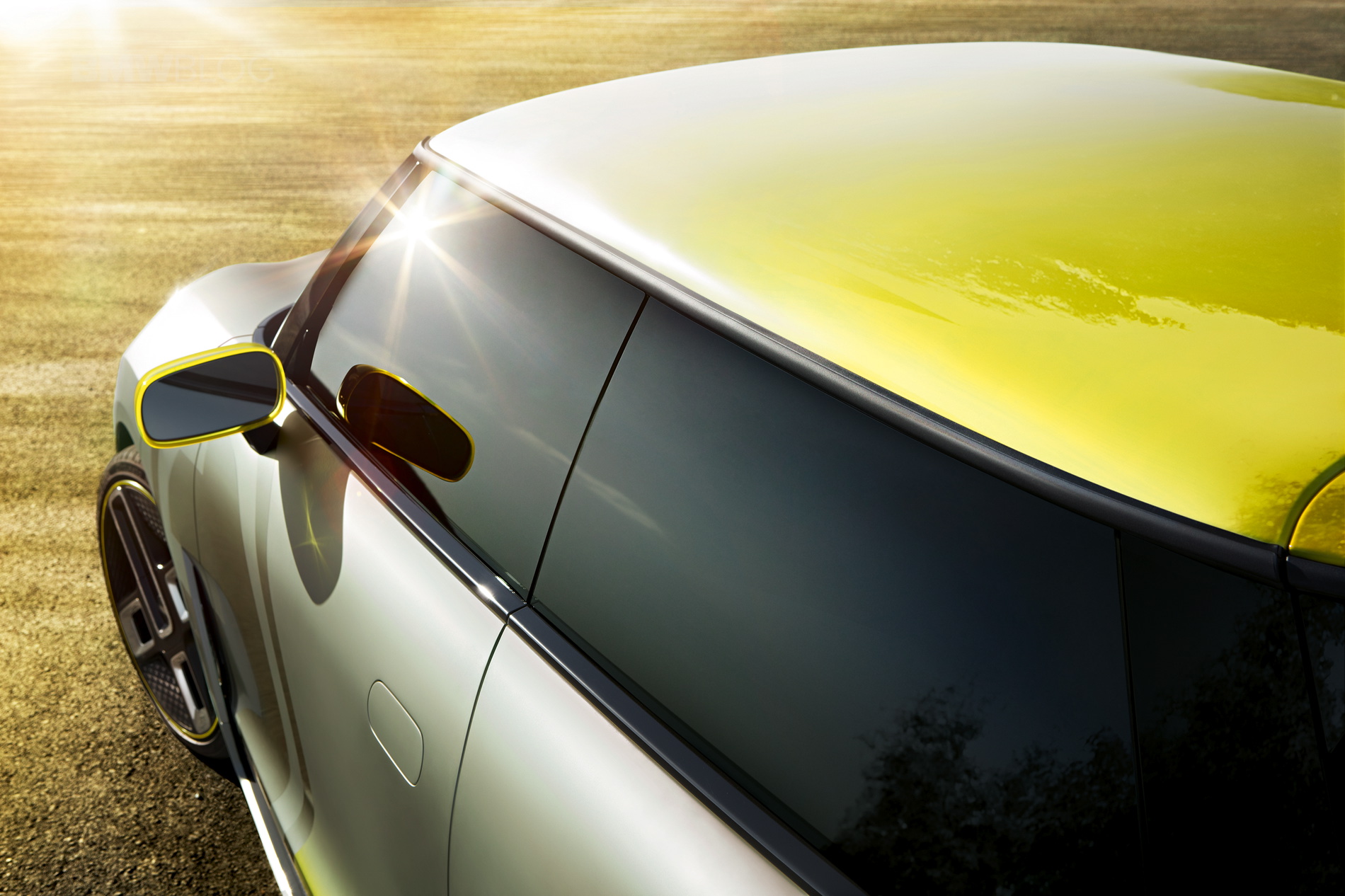 Clearly moulded fiber glass add-on parts along the lower edge serve to intensify the car’s snappy proportions. The paint finish in Reflection Silver – a matte liquid metal colour shade – showcases the surfacing design of the EV. Color gradients in the accent shade Striking Yellow, incorporated into both the roof and side skirts, add further flourishes. The colour of the roof flows from matt white to high-gloss yellow, while the yellow of the side skirts gains in transparency as it rises, appearing to merge into the body colour. These colour gradients accentuate the concept car’s lightness and modernity.