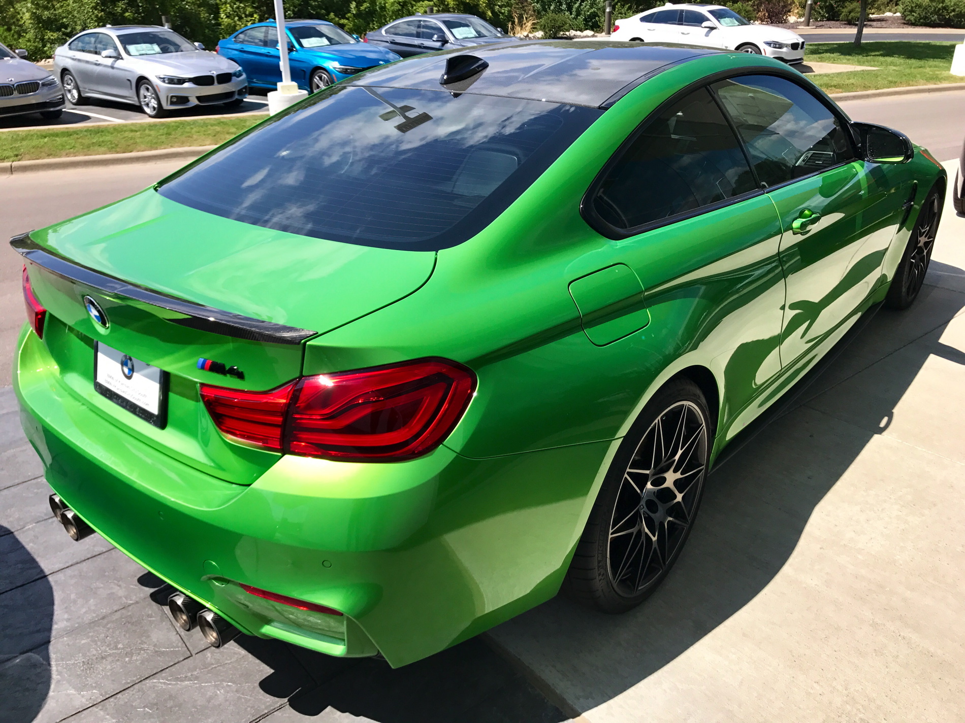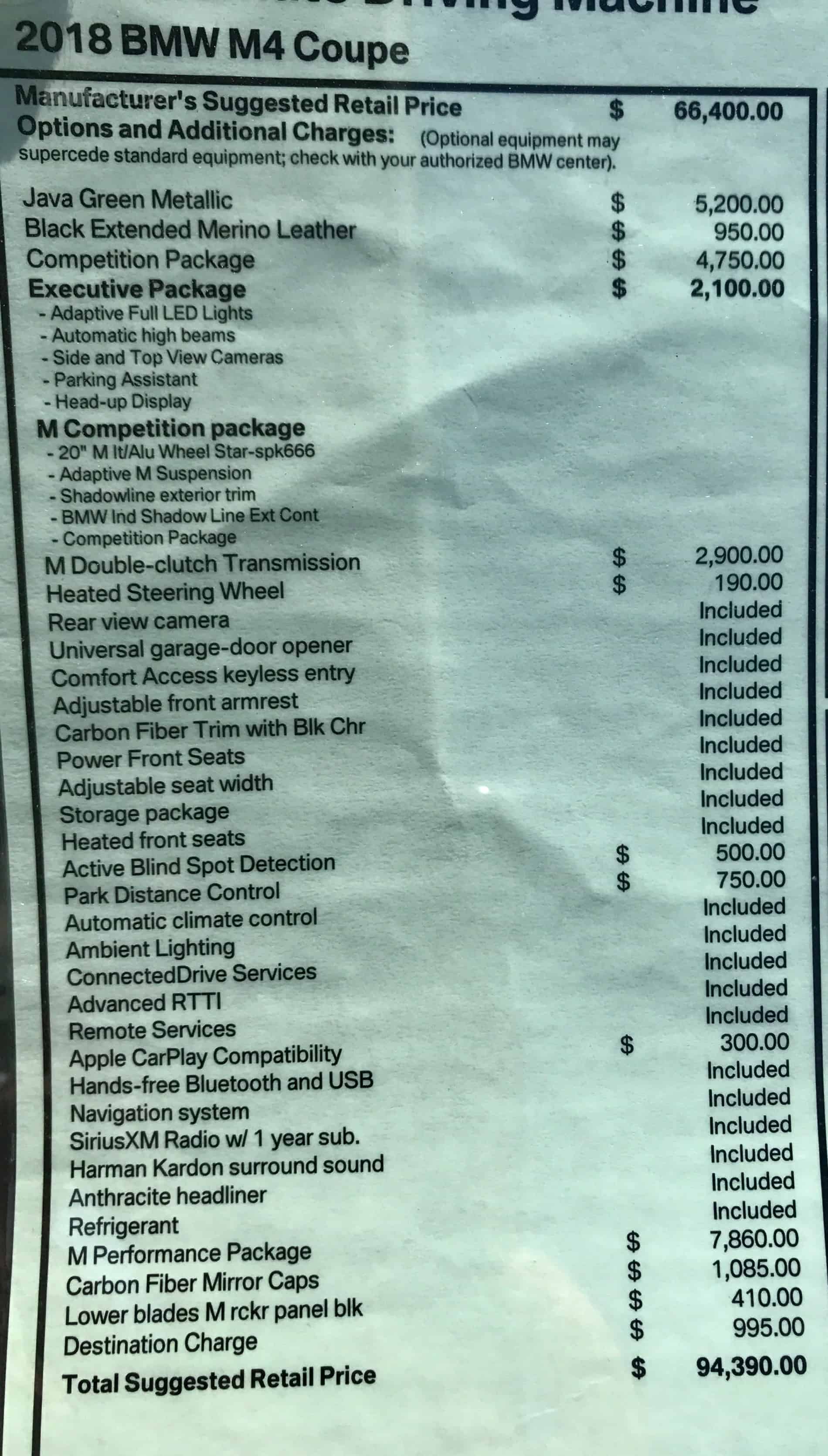 BMW M USA “Build your own” site shows only four paints above the standard ones and they BMW individual colors for $1,950. However, Java Green Metallic and the frozen colors are not listed at all here. As you can see, the Monroney Label on this M4 shows, these special paints cost $5,200 assuming you can find a dealer willing to go through the trouble to order them for you.