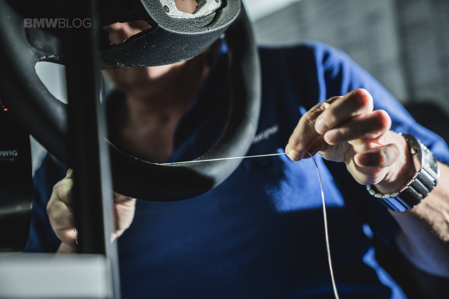 – Hand-finished steering wheel Opal White stitching, bespoke.