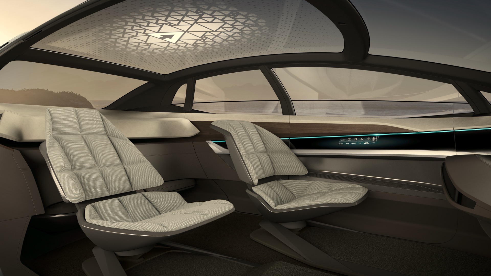 Up top, massive glass panels can display lighting or change their transparency. So in they day, they can either show the sunlight or block it out or anything in between. It can also illuminate with multiple Audi AI symbols, to light up the cabin.
