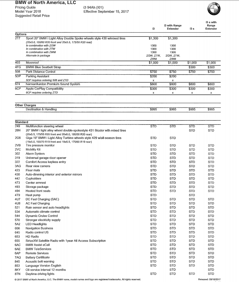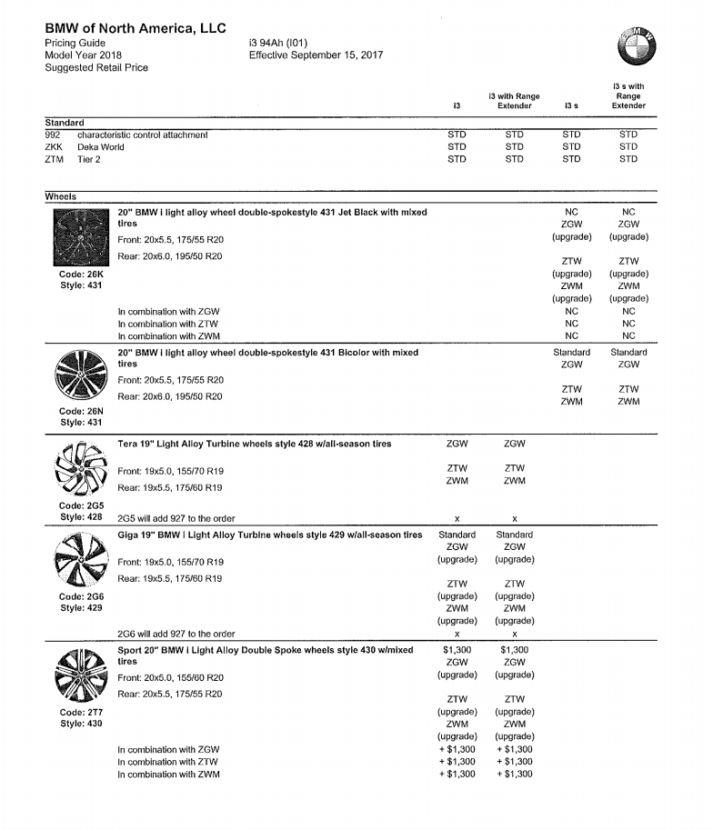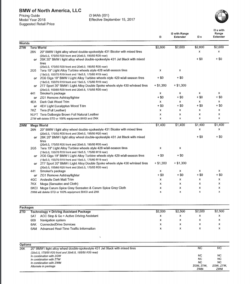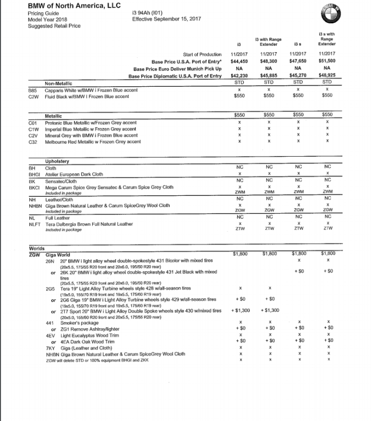 In these PDFs we’ve found, we can see the pricing and specs on the BMW i3, i3 REx, i3 S and i3 S REx. So it’s the full gamut of i3 models and all of their options. We can see the different “Worlds” that are available, all of their different options and even the wheel choices. It’s a pretty comprehensive spec sheet, so if you’re in the market for a new BMW i3 or i3 S, this could really help you chose what you want before the Bavarians officially release it.