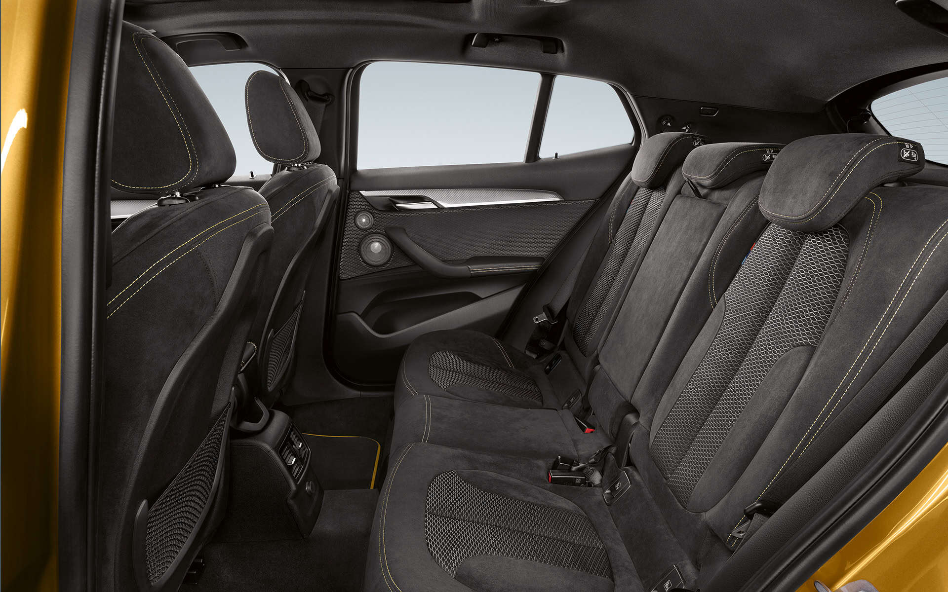 For the M Sport X model, an Alcantara fabric combination with M piping and contrast seams in yellow for the interior is also available for the Galvanic Gold finish. Exclusively for the X2 M Sport X is the interior trim aluminum hexagon anthracite with accent strip in chrome.