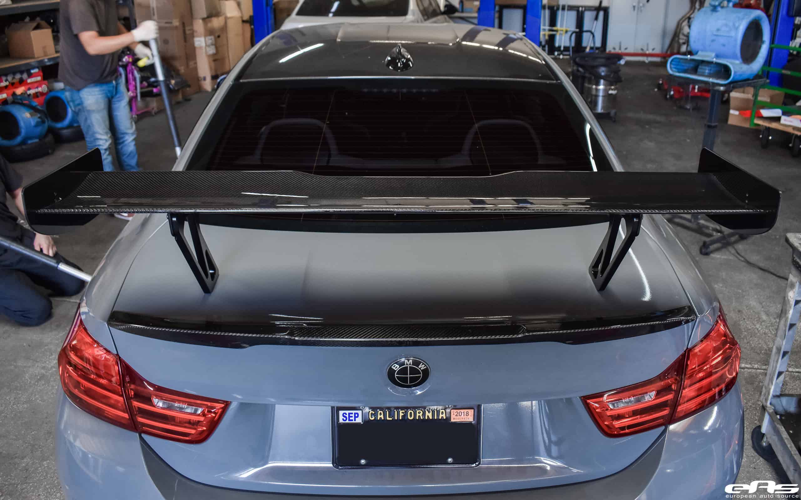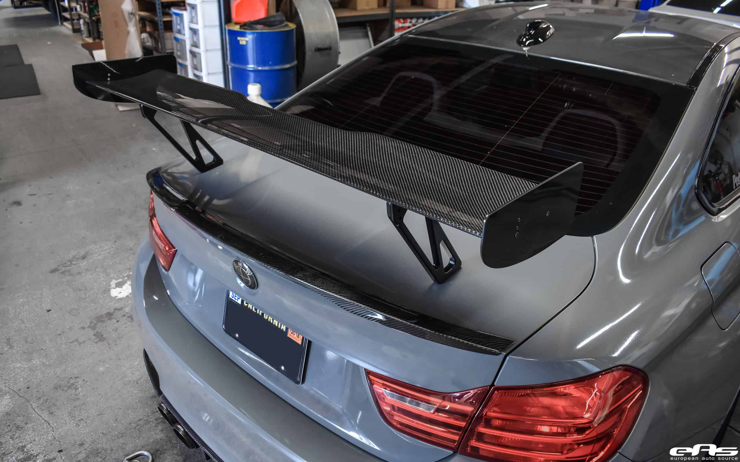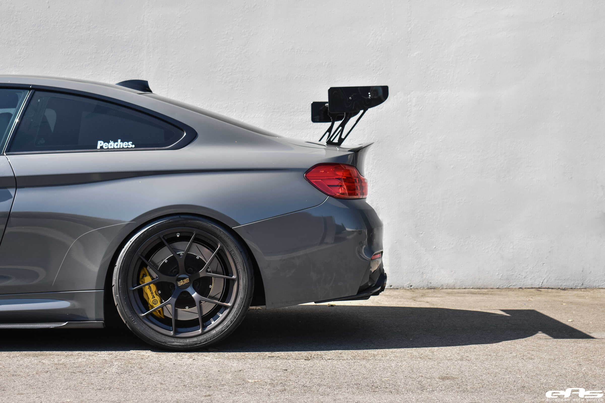 The build started off with a set of carbon fiber aerodynamic upgrades. The APR Performance carbon fiber front wind splitter was installed, followed by the BMW M Performance carbon fiber rear spoiler, carbon fiber front splitters and carbon fiber mirror caps. A Kohlenstoff carbon fiber rear diffuser is matched with an RKP GTS high wing mount set, giving the vehicle that BMW M4 GTS look. The overall dark/grey scheme suits the vehicle well, giving it a classy, understated, yet aggressive exterior appeal.