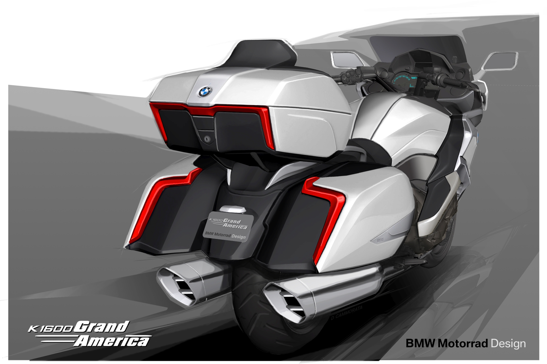 The design of the BMW K 1600 Grand America embraces the passion for relaxed, luxurious travel on two wheels that is especially widespread in the USA. For this purpose, the styling developed for the bagger concept of the BMW K 1600 B has been modified and a number of distinctive features have been added. In addition to the dynamically elongated side line that slopes evenly down to the rear, another clearly recognizable feature is the drop-shaped silhouette created from the visual link between the high-rising windshield and the low positioned side cases.