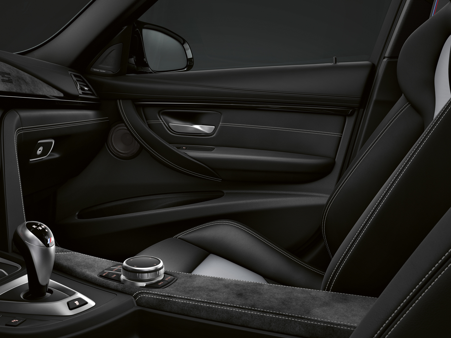Where the BMW M3 CS differs most from the M4 CS is on the inside. Where the cabin of the latter car is almost GTS-like, with its carbon fiber door skins and fabric door pulls, the M3 CS is a bit softer, a bit more luxurious. Its door panels are covered in contrast-stitched leather, as is the dashboard, and the seats are a unique combination of Silverstone/Black two-tone leather. In fact, there doesn’t seem to be a whiff of carbon fiber in the cabin, which is actually refreshing. Instead, the only lightweight material is Alcantara, which adorns all the trim, such as on the dash and the center console. Like the M4 CS, the armrest has been deleted here and is just covered in Alcantara instead. Overall, it’s a lot better looking than the interior of the M4 CS, which is a bit too boy-racer.