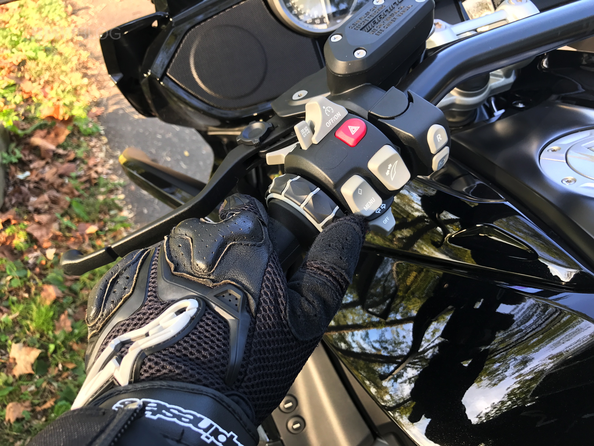 To the right of the menu button is a button I later became very fond of using. That is the button which controls the windscreen. Depressing the upper and lower edges of the button enables the raising and lowering of the windscreen. At its greatest height, it mimics the aesthetic of a peacock, as it draws the eyes of onlookers. At its lowest, it appears quite sleek and better balanced with the bike’s proportions, though noticeably less efficient at directing airflow.