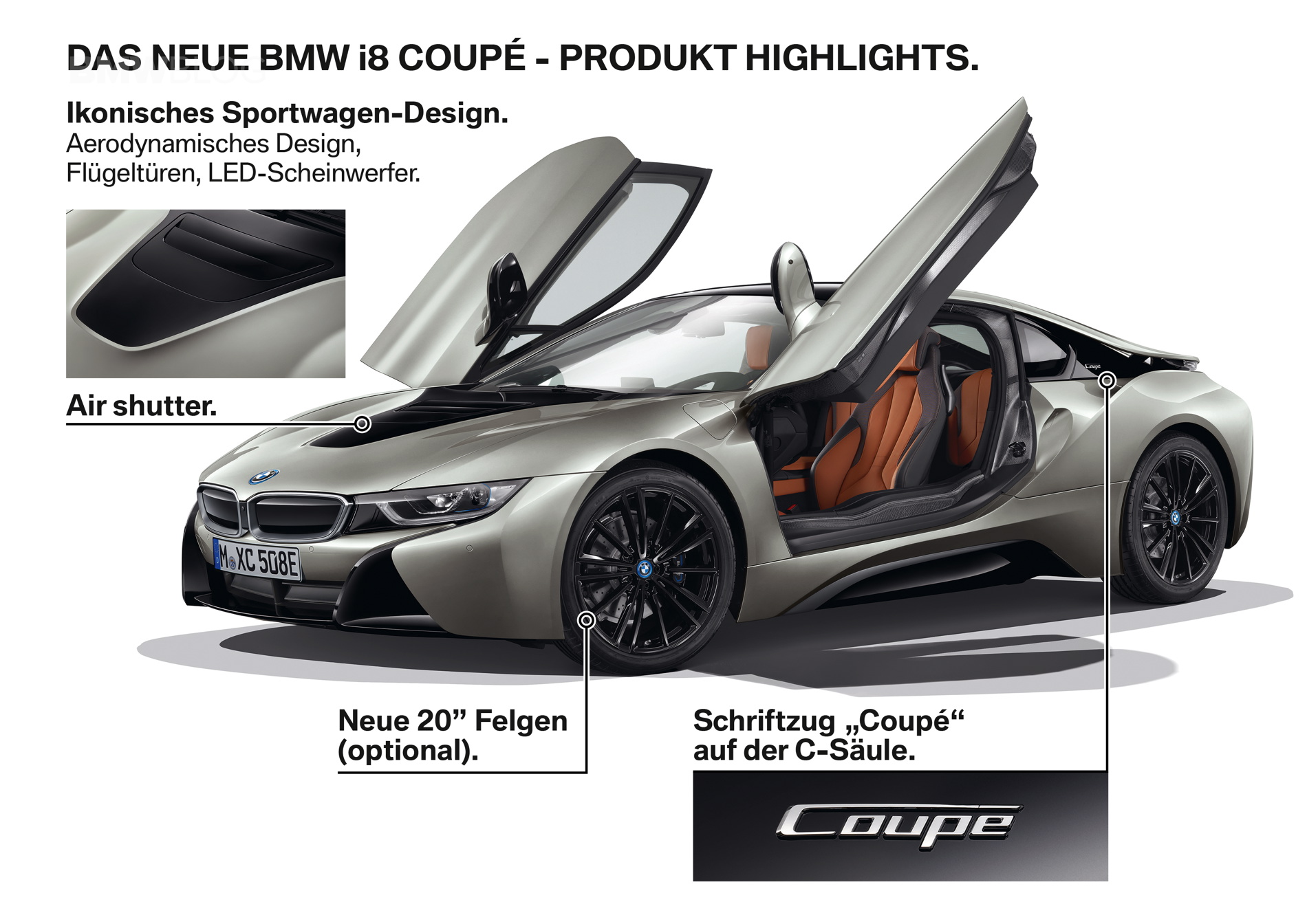 From the outside, changes to the BMW i8 have been kept to a minimum. After all, don’t fix what ain’t broken, right? There are ever-so-slightly new headlights that feature more rectangular bulbs inside the housings, a new air shutter on the hood, new wheels and a “Coupe” emblem on the C-pillar. The changes are minimal but they actually make it look sportier, more aggressive than before. The wheels are probably the most noticeable difference but the air shutter looks good, too. As previously stated, the changes are minimal but the car does look a bit better.