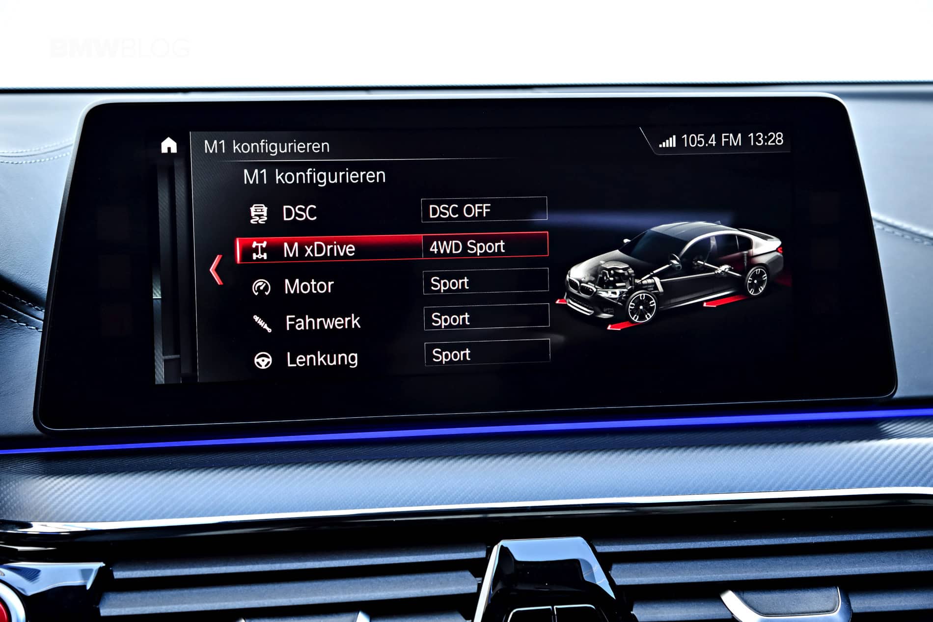 When first started, the BMW M5 will be in its normal “4WD” mode with DSC (Dynamic Stability Control) on. From there, the driver can tune the drivetrain to his/her liking. There is also a “4WD Sport” mode, which sends more power to the rear wheels all of the time. It also allows for more slip and bigger slip-angles, for both more fun and better track handling. To increase the fun even further, the DSC gets switched to MDM (M Dynamic Mode) when put into 4WD Sport.